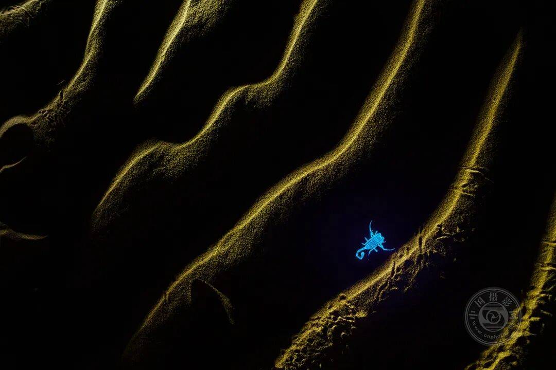 在沙漠的深夜中心,一只散发荧光的蝎子穿行于起伏的沙丘之间,在『紫外线』的照射下,它的身体呈现出诡异的蓝色光芒。由风与阴影雕琢而成的金色沙脊,与这只生物那发光的身躯形成鲜明对比,凸显出它隐秘的夜间世界。这张照片象征着黑暗中悄然上演的隐秘生存故事——当世界沉睡时,生物们如何适应环境、摸索前行并展开猎食。它捕捉到了极端环境下夜生活的寂静、危险与奇妙。蝎子发出的荧光既是一种警告⚠️,也是一件奇观,提醒着我们,夜晚默默守护着那些不为人知的美丽与复杂。