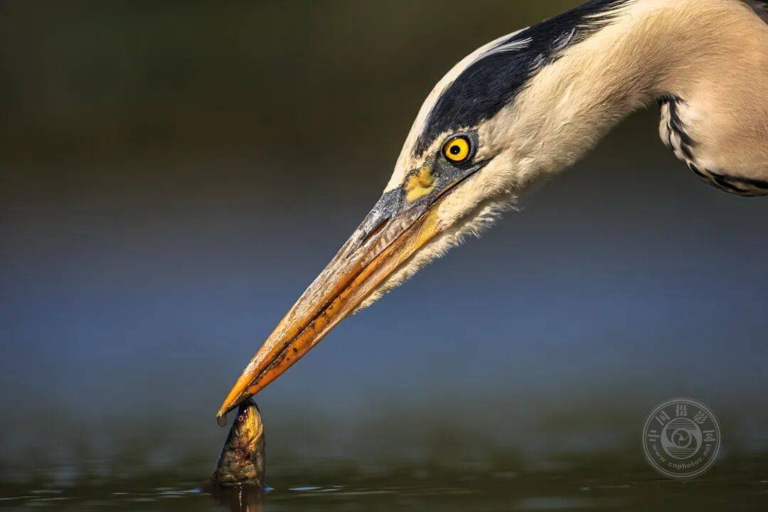 一只苍鹭叼着刚捕获的一条小鱼。