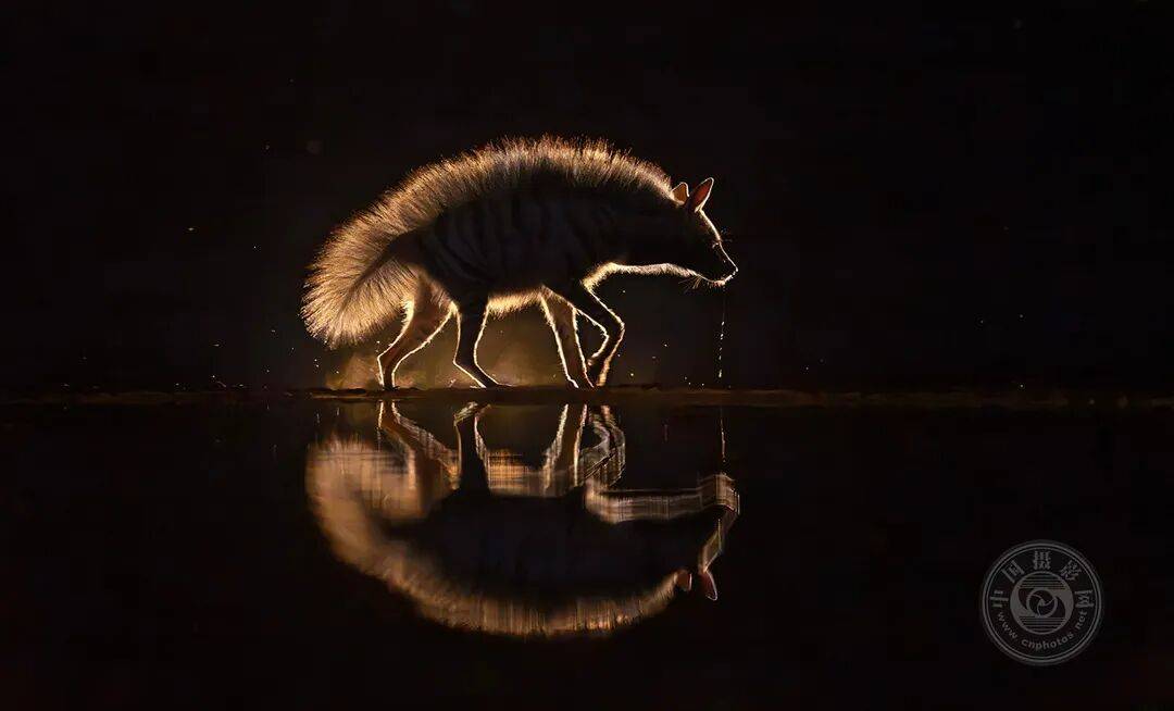 这张照片展现了条纹鬣狗饮水后离去的瞬间。条纹鬣狗偏好在夜间捕猎,它们栖息于干旱地区,在捕猎后需长途跋涉寻找水源。在自然界中,你永远无法预知下一刻会发生什么,尤其是在夜间拍摄时更是如此。这种濒危的条纹鬣狗外形并不出众,但唯有通过夜间摄影,才能充分展现它那蓬松的毛发和优美的身体轮廓。这张照片旨在唤起人类改善这种迷人野生动物生存条件的意识。
