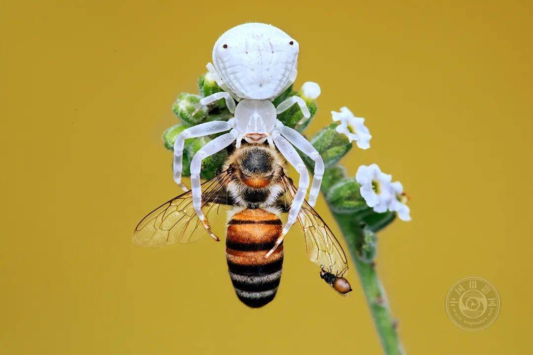 在这张引人注目的微距照片中,一只蟹蛛稳坐于盛开的植株之上,尽显其强势地位,将一只蜜蜂困于生死一瞬之间。蜘蛛紧紧钳住蜜蜂,加之其与周围环境融为一体的静止姿态,无声地诉说着耐心、精准与原始生存本能的故事。一只小蝇悄然停歇在蜜蜂翅膀上,未被察觉——它无意间成了这场微观世界争斗的见证者,凸显出自然界食物链错综复杂的层次。纯净的金色背景将这一场景孤立出来,让观者得以聚焦于美丽与残酷之间的紧张与反差。这张照片所展现的不仅仅是捕食行为,它更是一个视觉隐喻,诠释了无声中的力量、静止中的掌控力,以及微小生命形态中蕴含的强大力量。