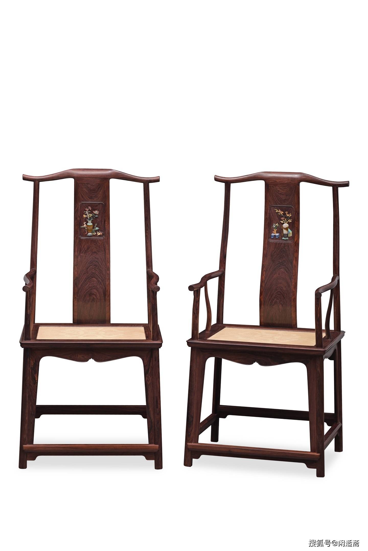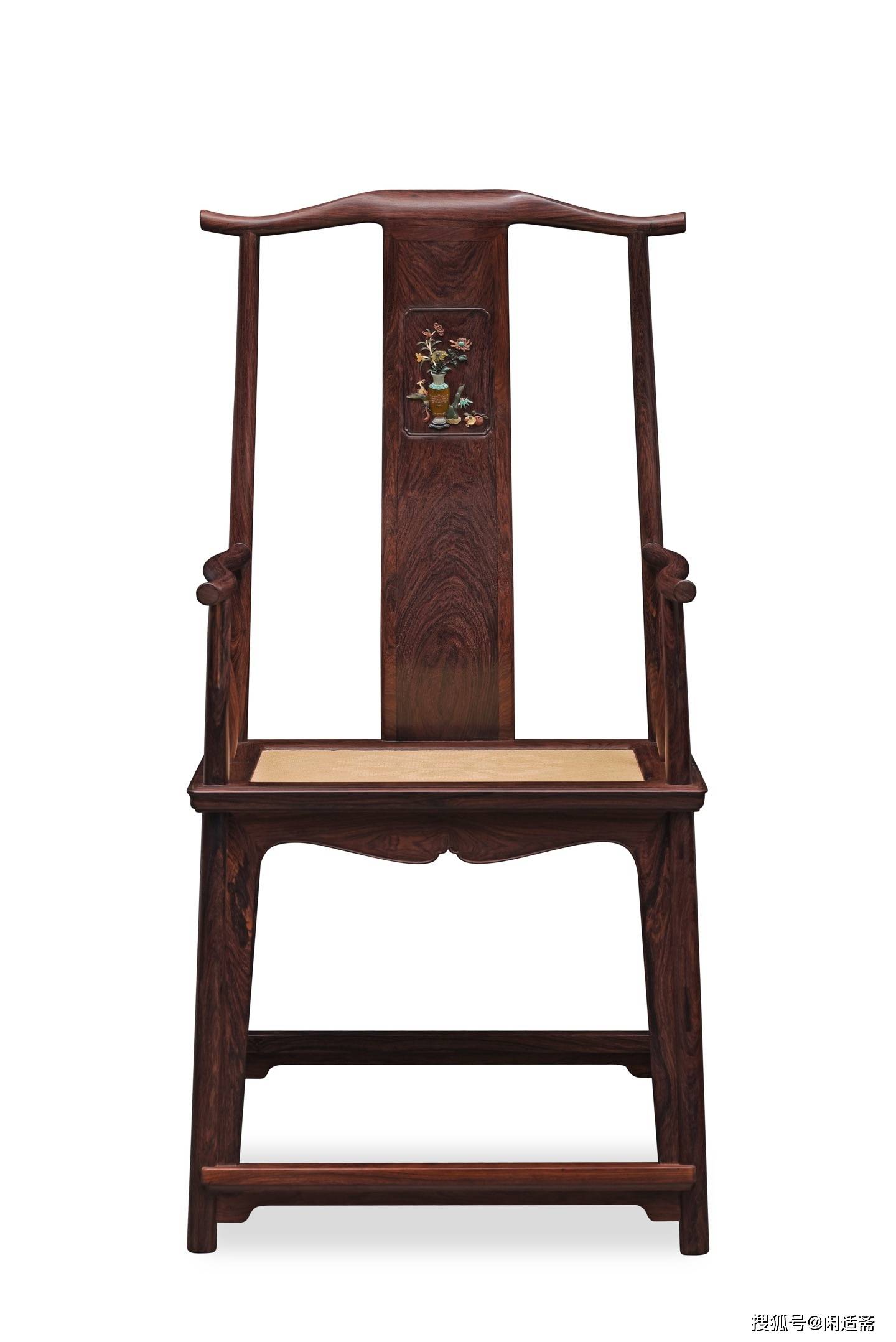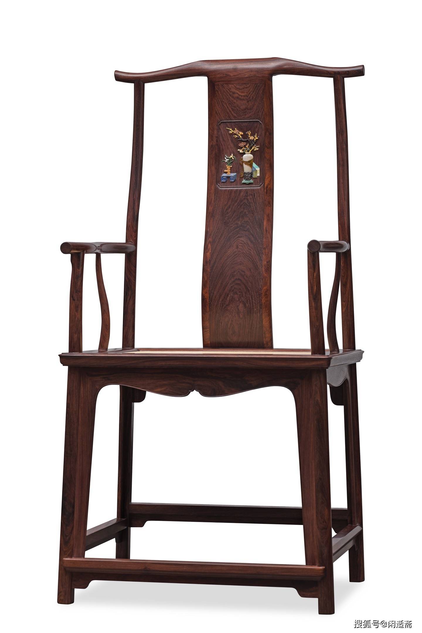 靠背板为整料开光设计,其上采用百宝嵌工艺雕琢“四君子”清供图案,是整件器物的点睛之笔。工匠甄选螺钿、象牙、寿山石、绿松石等多种珍材,经精细裁切、打磨、镶嵌,每一处细节都精益求精。图案色泽清雅,层次分明,梅兰竹菊四君子形态各异、栩栩如生,既彰显君子谦谦之风,又承载着高洁清雅、温润如玉的美好寓意,传递出文人雅士的精神追求。