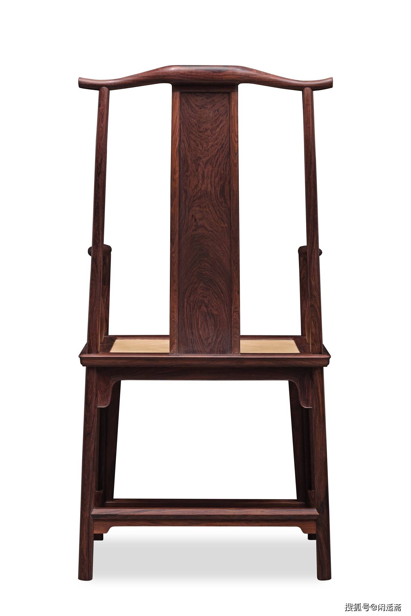 椅形恪守经典明式四出头官帽椅形制,端方大气,线条刚劲流畅,无一丝冗余雕饰,完美诠释明式家具“简约而不简单”的精髓。搭脑与扶手前端四端出头,线条利落挺拔,尽显器物的庄重威仪;椅身框架衔接严丝合缝,榫卯结构精巧坚固,保证了使用的稳固性,又彰显了古人“天人合一”的营造智慧,坐感舒适贴合人体工学,兼具文人风骨的温润与礼制器物的庄重。