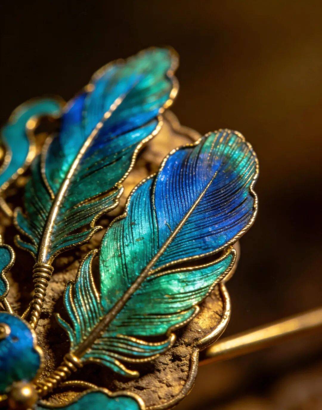 点翠是中国古代贵族专属的传统非遗工艺,也是极具特色的羽毛装饰技艺,核心是金银为胎、掐丝成型后,取翠鸟背部亮蓝羽毛,用特制胶料逐点粘贴制成首饰、头饰等,无需颜料便自带天然流光。其发展脉络清晰,汉代已有翠羽装饰雏形,宋代工艺成熟定名“铺翠”,明清达到巅峰,清代造办处设“点翠作”,成为后妃饰品标配,近代因生态保护改用仿翠材料,让技艺得以传承。