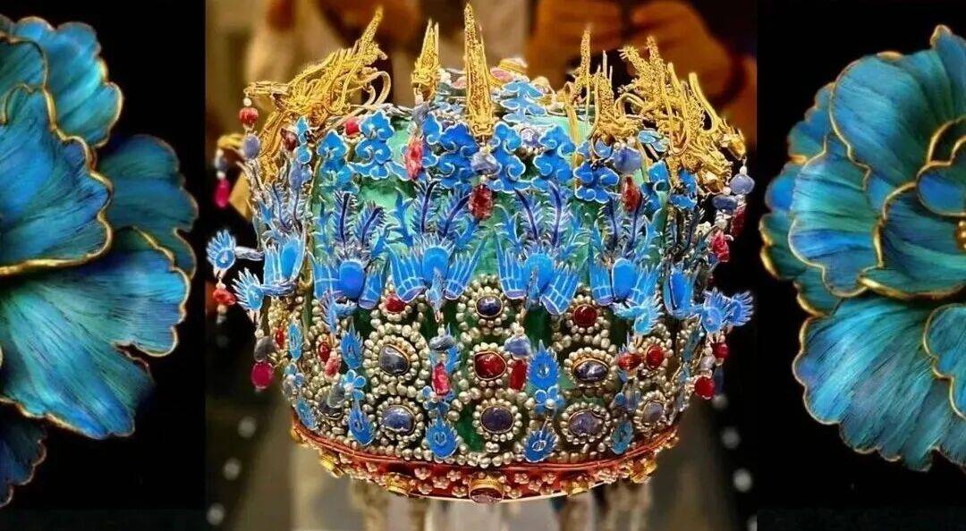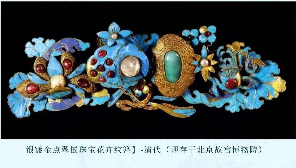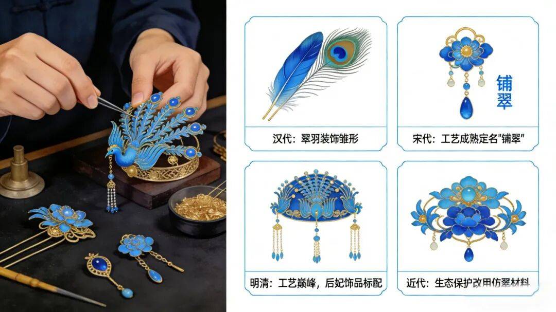 点翠技艺全程纯手工,核心工序包括制胎、选翠、修羽、点粘、阴干定型,精细度极高;其独特之处在于翠羽的蓝是“结构色”,由羽毛内部微结构折射光线形成,历经百年不褪色,被称为“活色”。文化层面,翠羽的绀蓝色象征皇权与端庄,饰品纹样多为龙凤、牡丹、蝙蝠等,承载着吉祥富贵、平安顺遂的美好寓意。