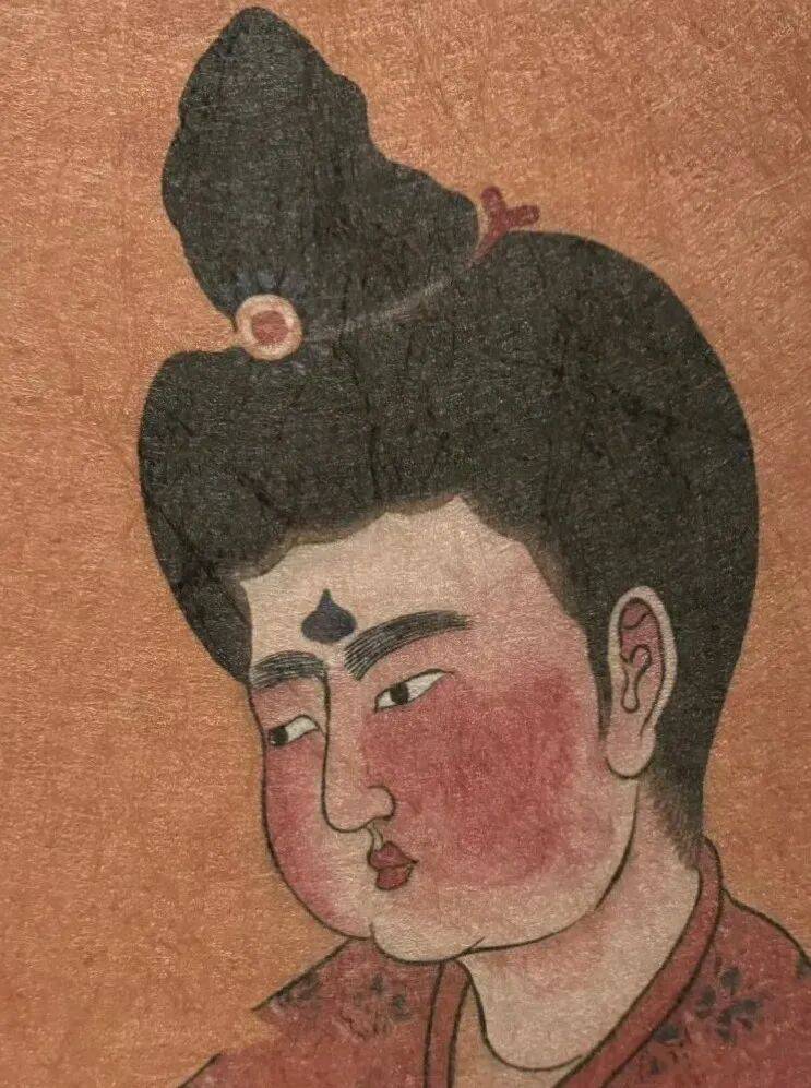 斜红,是描于太阳穴处的弯月状装饰,形似伤痕,色如霞红。传说此妆起源于魏文帝宠妃薛夜来误伤面颊后留下的疤痕,竟成风尚。唐代女子将其化为『妆容』,或描作新月,或勾勒残霞,成为一抹极具戏剧性的点缀。