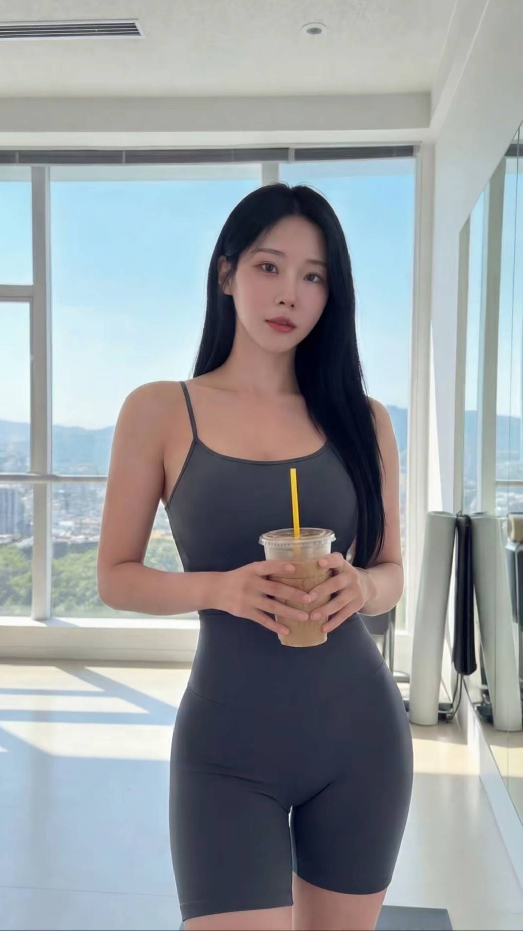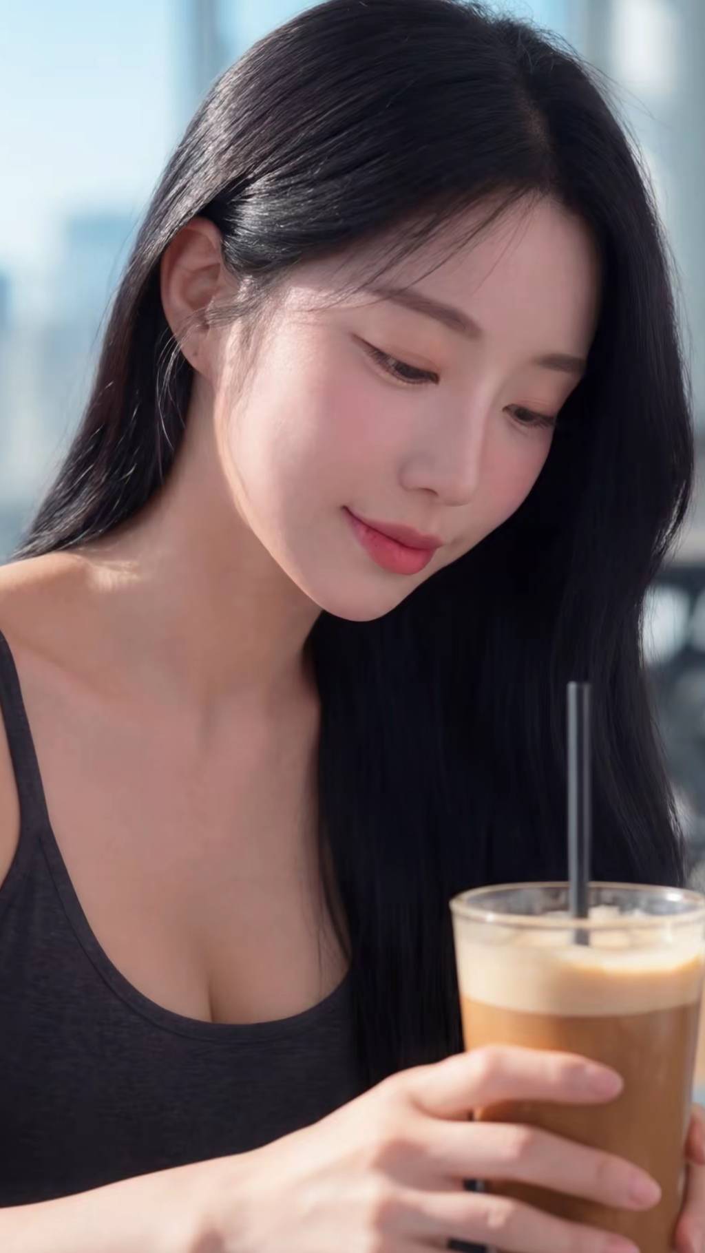 手持一杯冰饮,微凉触感抵不过阳光的温度。她的目光时而落在屏幕上,时而飘向窗外的城市与远山,时而又与镜头的凝视坦然相遇。没有刻意的表演,只有晨光中一份私密的惬意——仿佛时间在此刻放缓,允许她完全沉浸于自我的节奏里。
