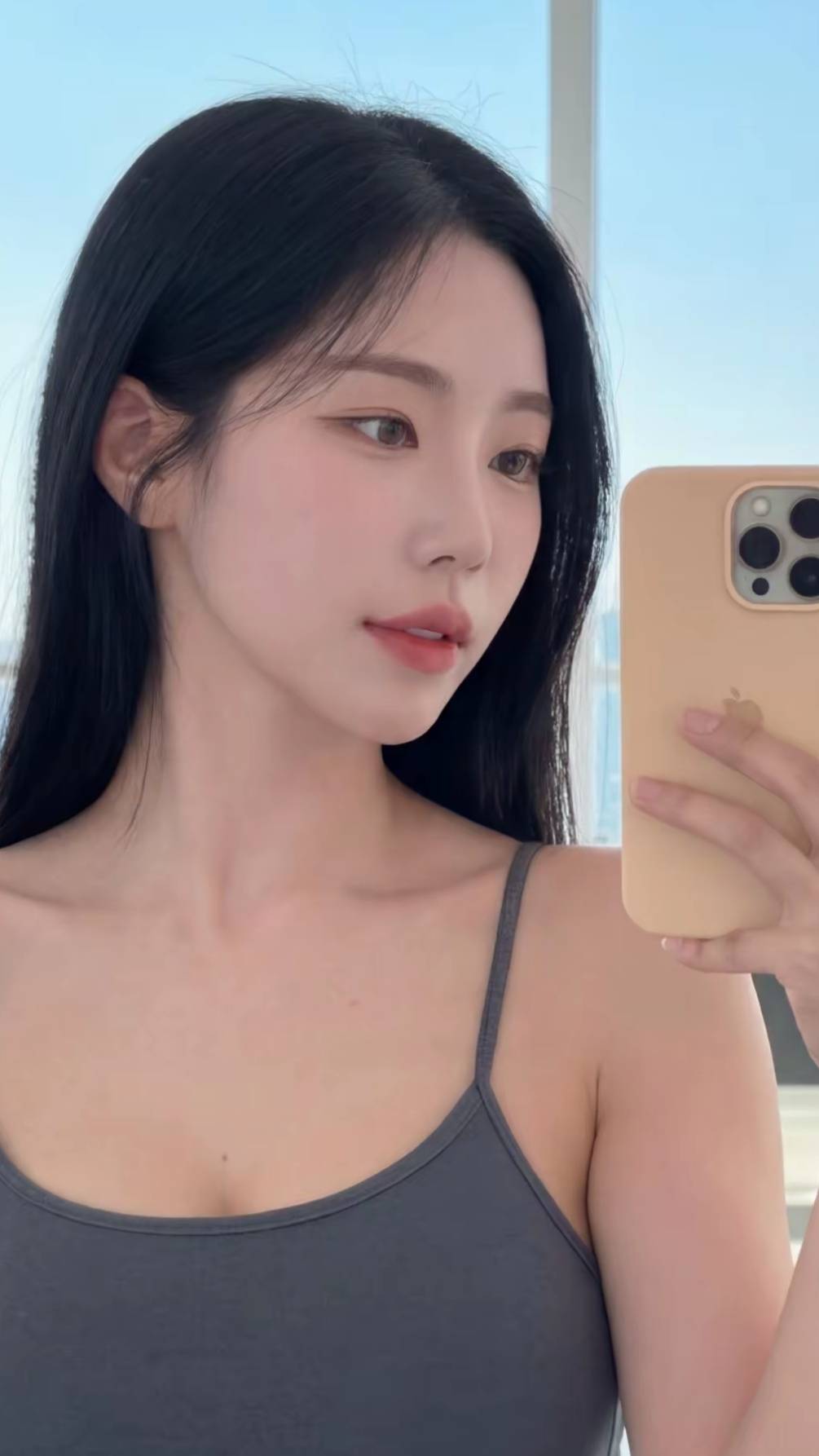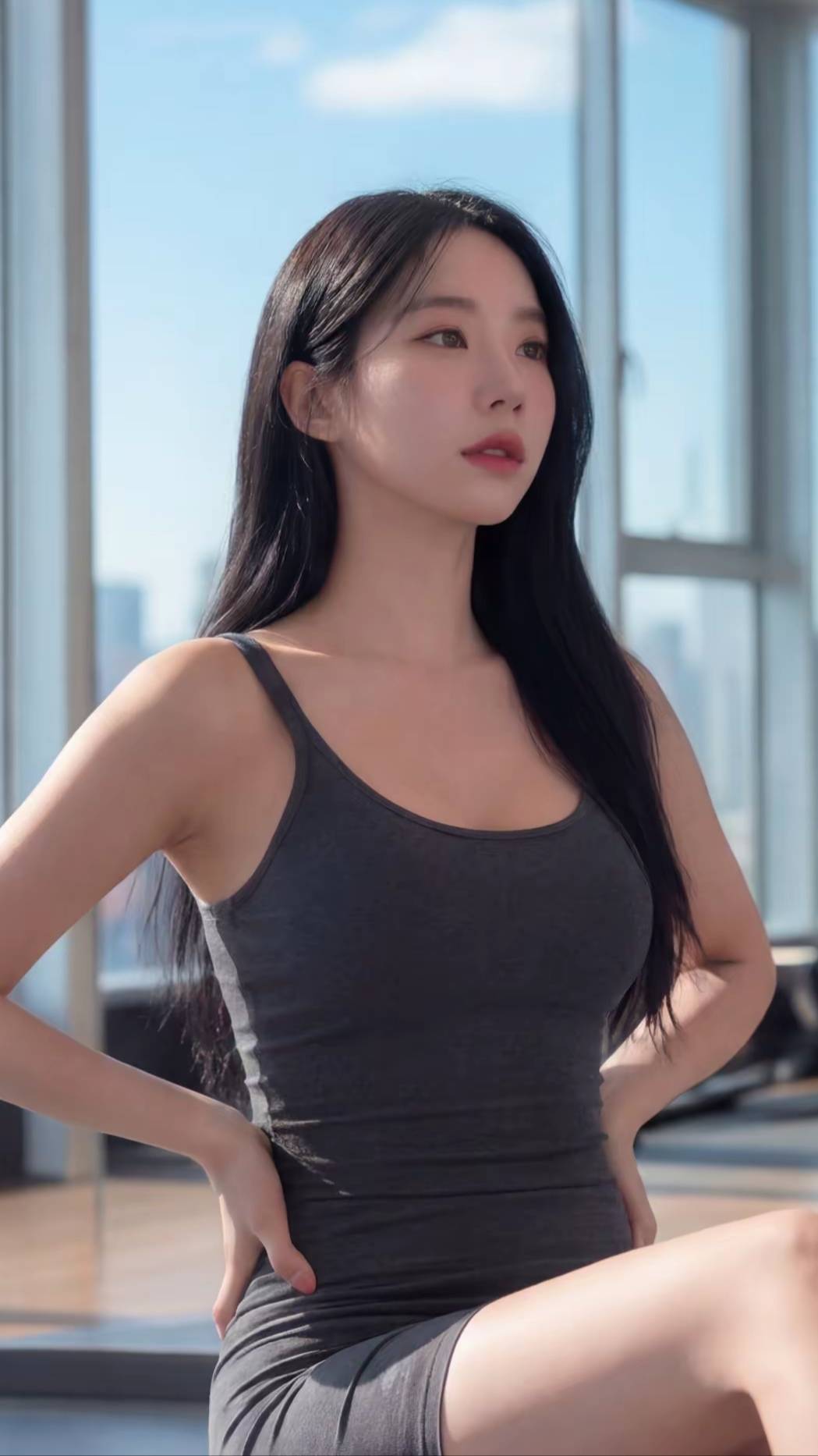 一袭深浅不一的灰色吊带,是她最舒适的战袍。或坐或卧,在瑜伽垫上寻得一方天地。看手机时的专注,闭目养神时的宁静,侧身远眺时的疏懒,每一个姿态都松弛而真实。乌黑『长发』垂落,与简约的衣装勾勒出纯粹的身体线条。