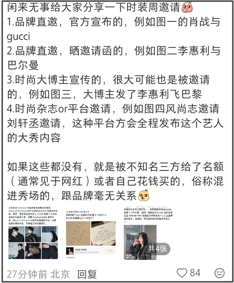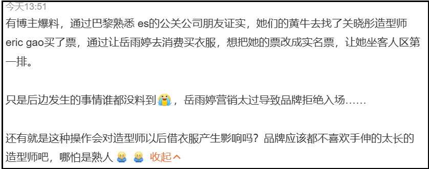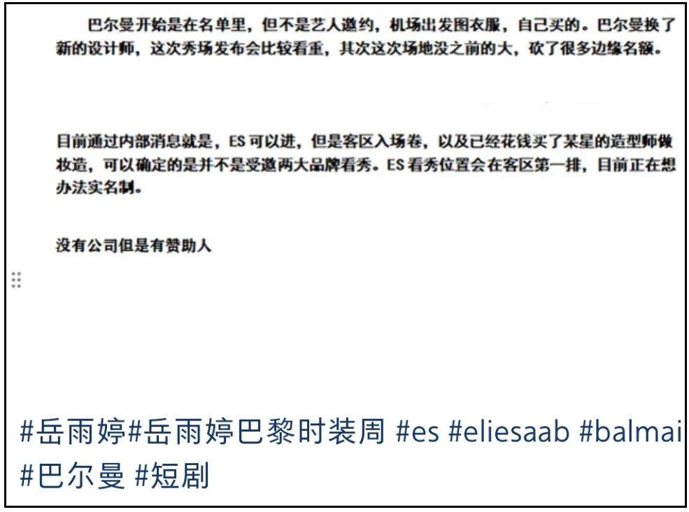 还有一点不得不提,岳雨婷人在巴黎没能进场,然而她还是没有意识到问题,竟然发文回应因为不可抗力才缺席看秀,某种程度上,这个行为比蹭秀更恶劣。