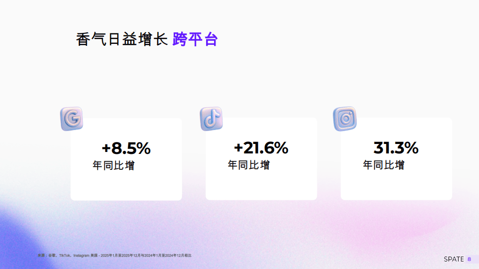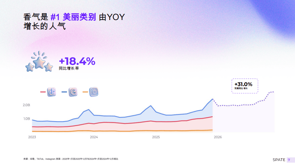 《2026年『香氛』报告》依托Spate跨平台数据,分析了一点通、TikTok、Instagram超9000亿搜索信号及海量社媒内容,揭示2026年美国『香氛』市场线上化主导的发展趋势,『香氛』已成为消费者自我表达的载体,而非单纯商品,且该品类成美妆领域同比增长榜首,2025年同比增18.4%,2026年预测增31.0%,各平台均实现增长。