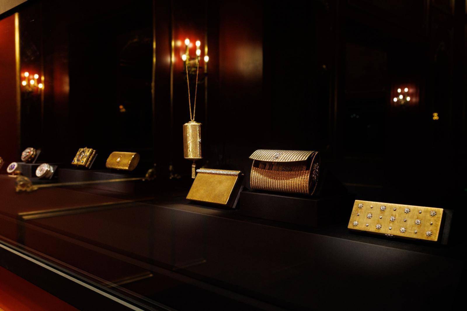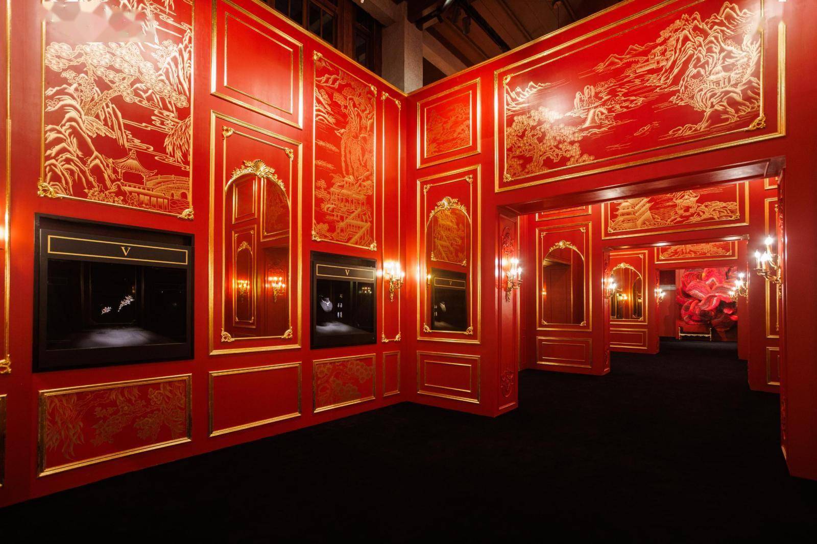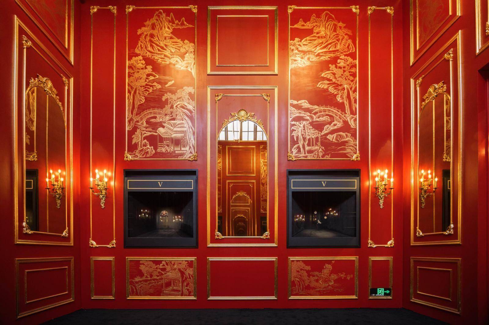 展厅空间设计本身即是一场东西美学对话:欧洲古典主义建筑风格的长廊、巴洛克风格繁复的曲线韵律、中国非遗工艺漆面描金勾勒的山水亭台……东方风骨与法式韵律在此交错映照,营造出深远融通的意境。