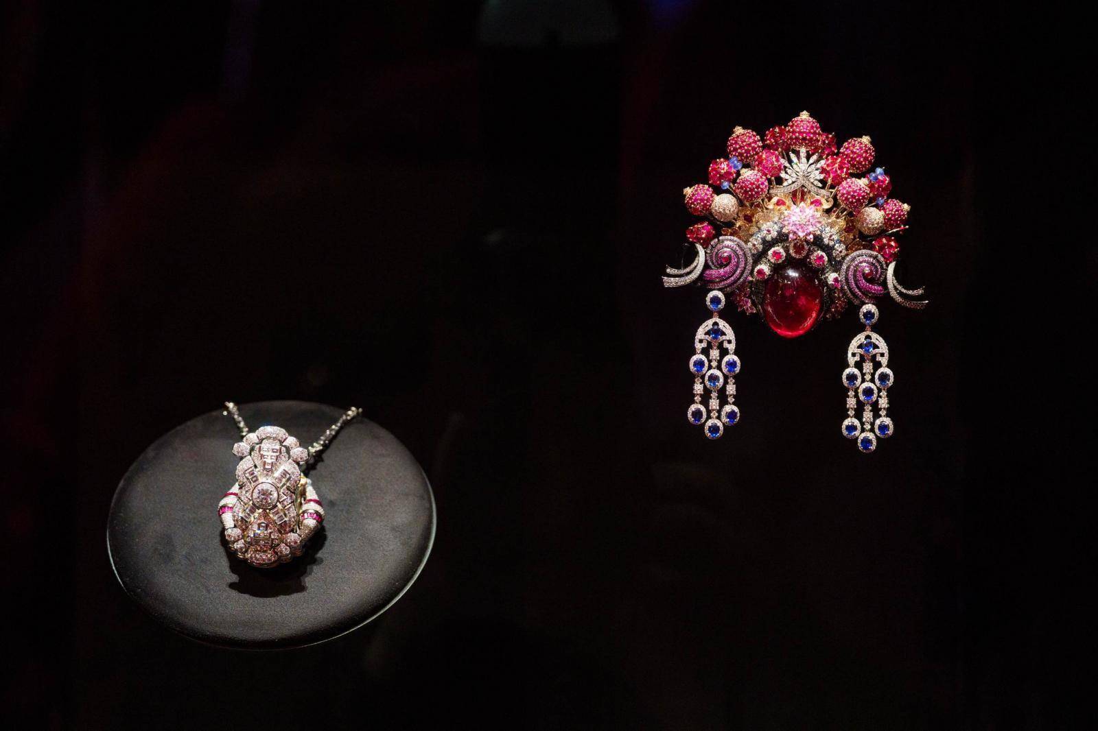 在展品方面,多件重要历史珠宝集中亮相。其中包括1905年法国珠宝商Mellerio创作的孔雀羽饰,以金、铂金、珐琅与钻石构成,结合新艺术风格与东方文化象征;法国珠宝『设计师』René Boivin于1938年设计的海星胸针,则以红宝石与紫水晶镶嵌呈现海洋主题,被认为是装饰艺术时期的重要珠宝作品之一。