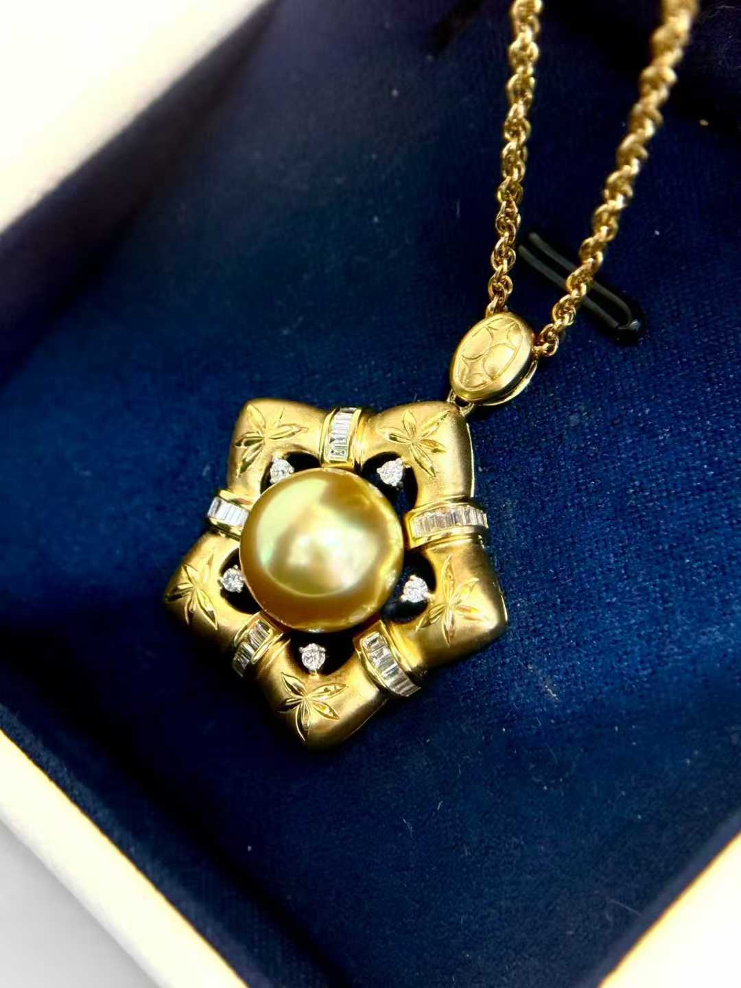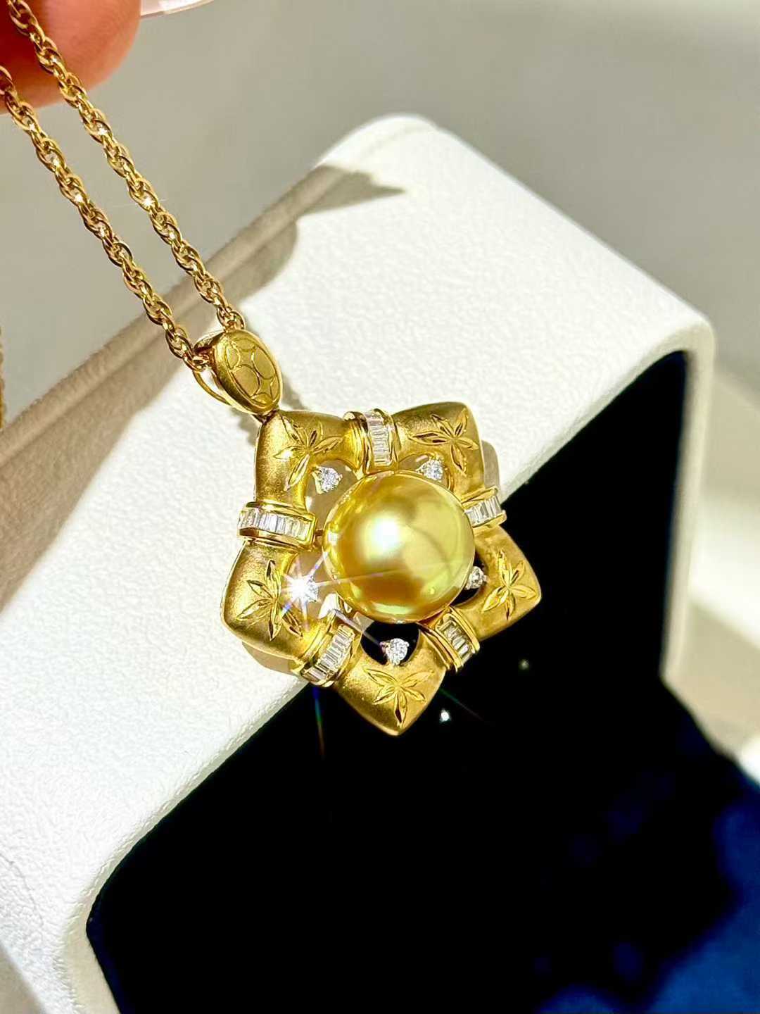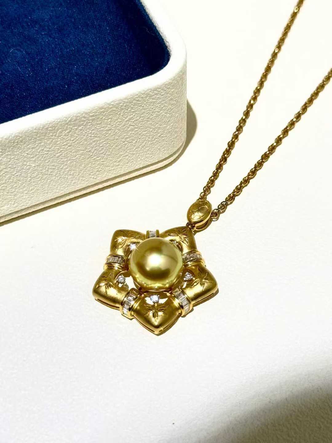 金珠星星💫吊坠 11-12mm 浓金绿光 正圆极光 基本无瑕 18K金磨砂工艺 钻石💎0.328ct 复古设计 叶子雕刻精美别致 (不含链)
