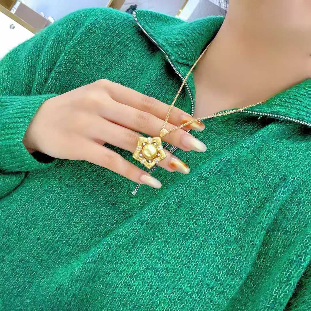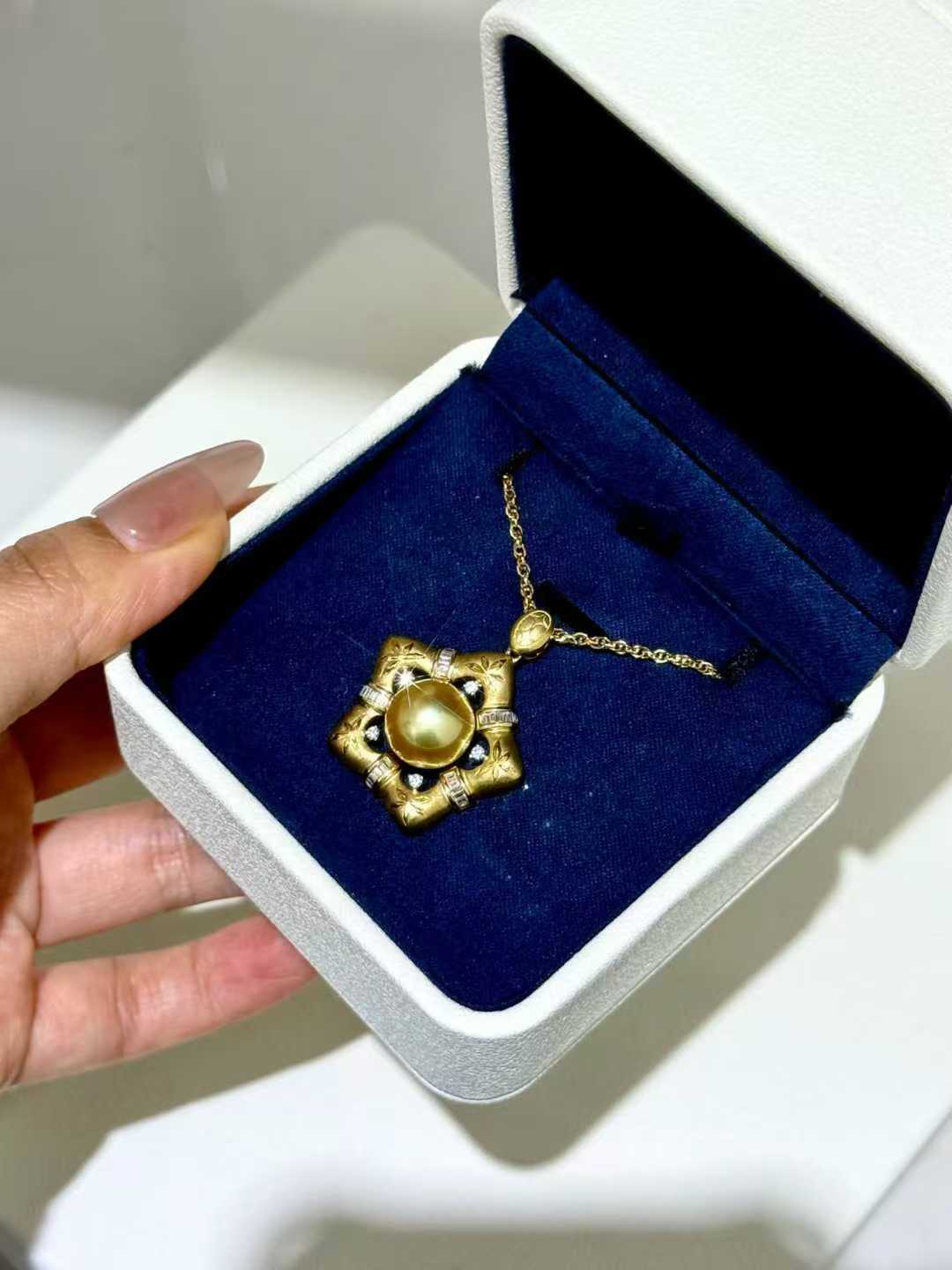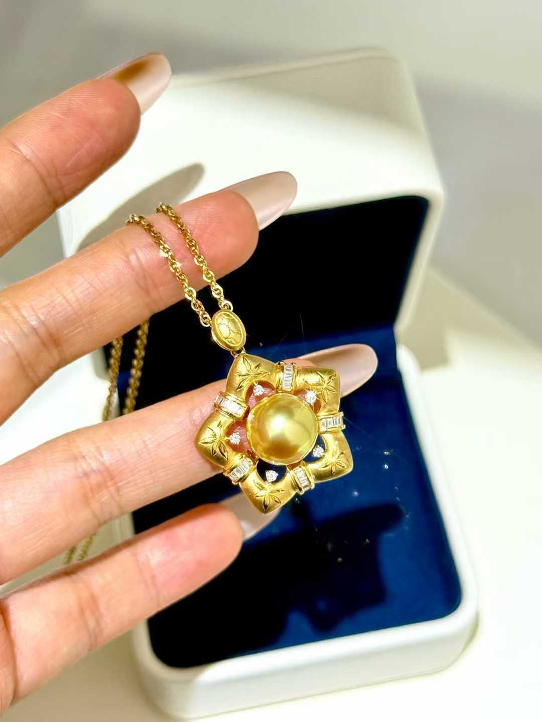 金珠星星💫吊坠 11-12mm 浓金绿光 正圆极光 基本无瑕 18K金磨砂工艺 钻石💎0.328ct 复古设计 叶子雕刻精美别致 (不含链)