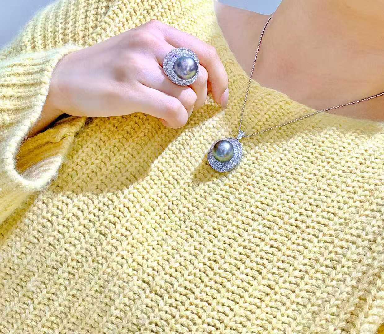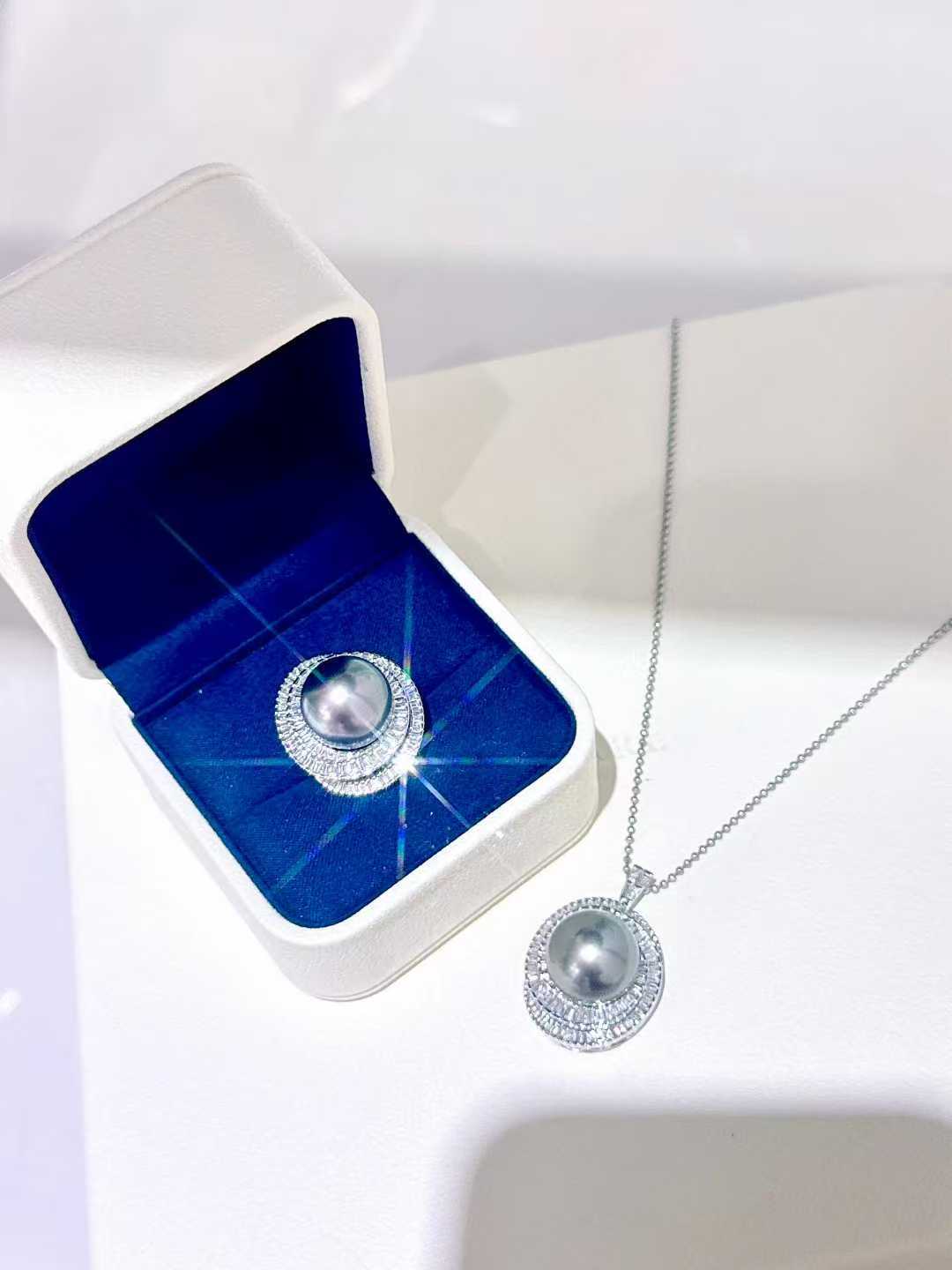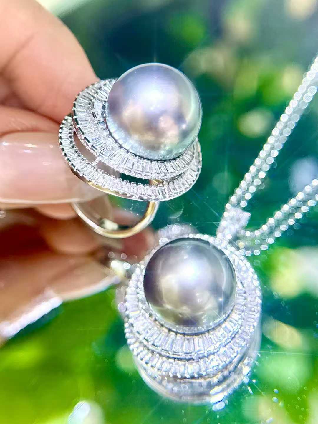 气场无敌的大溪地满钻套装 戒指💍15-16mm 正圆极光微瑕疵 孔雀紫绿光泽 18K白金💎1.216ct;吊坠15-16mm 白金💎1.635ct (不含链)高品质T方钻有序排列 经典永不过时 轻松拿捏时尚感✨