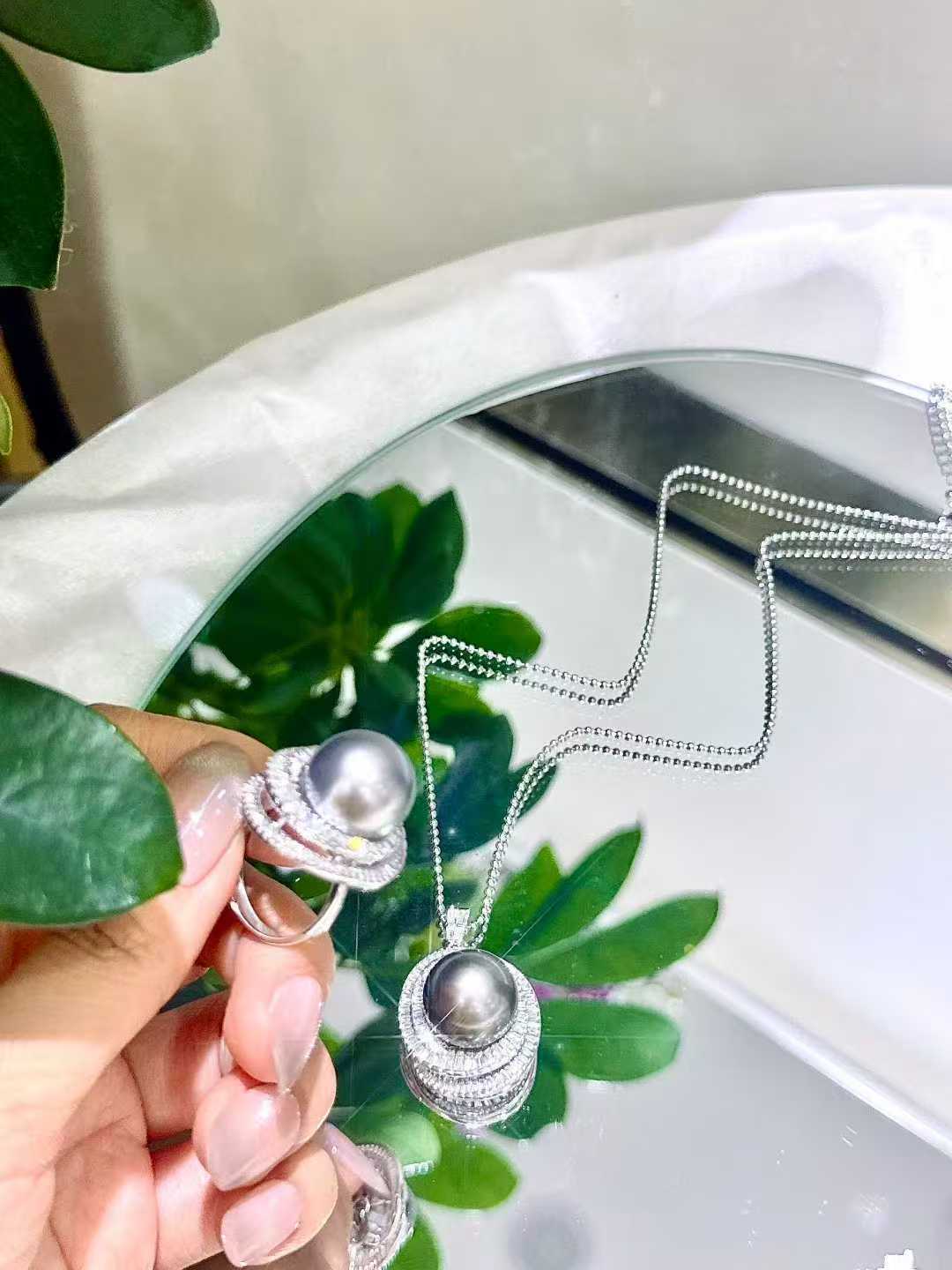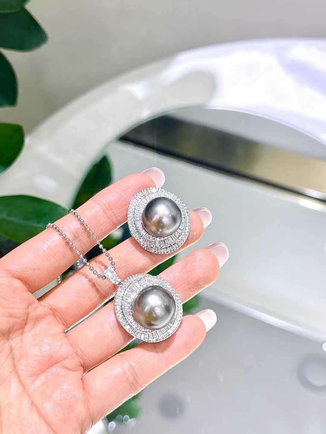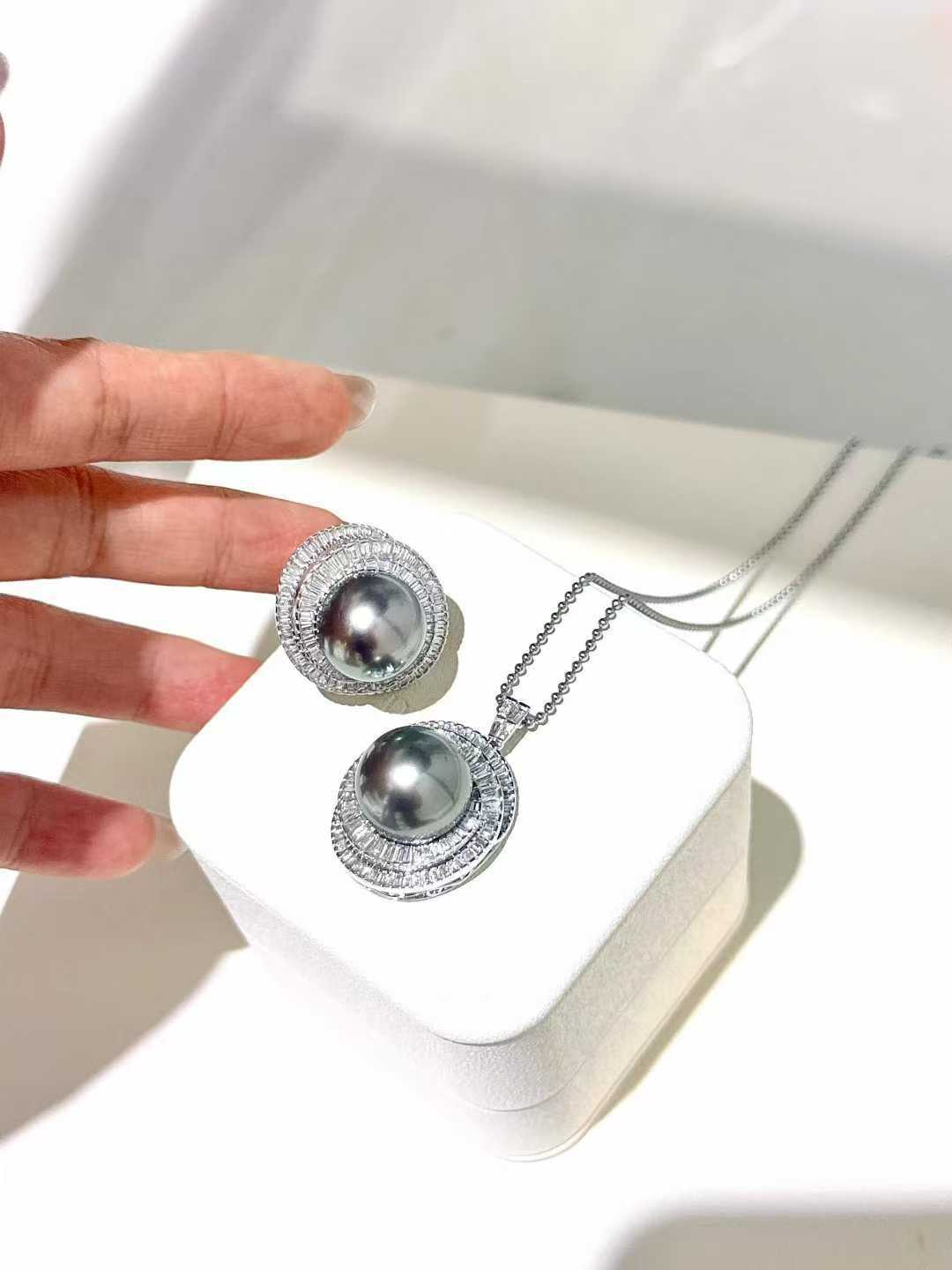 气场无敌的大溪地满钻套装 戒指💍15-16mm 正圆极光微瑕疵 孔雀紫绿光泽 18K白金💎1.216ct;吊坠15-16mm 白金💎1.635ct (不含链)高品质T方钻有序排列 经典永不过时 轻松拿捏时尚感✨