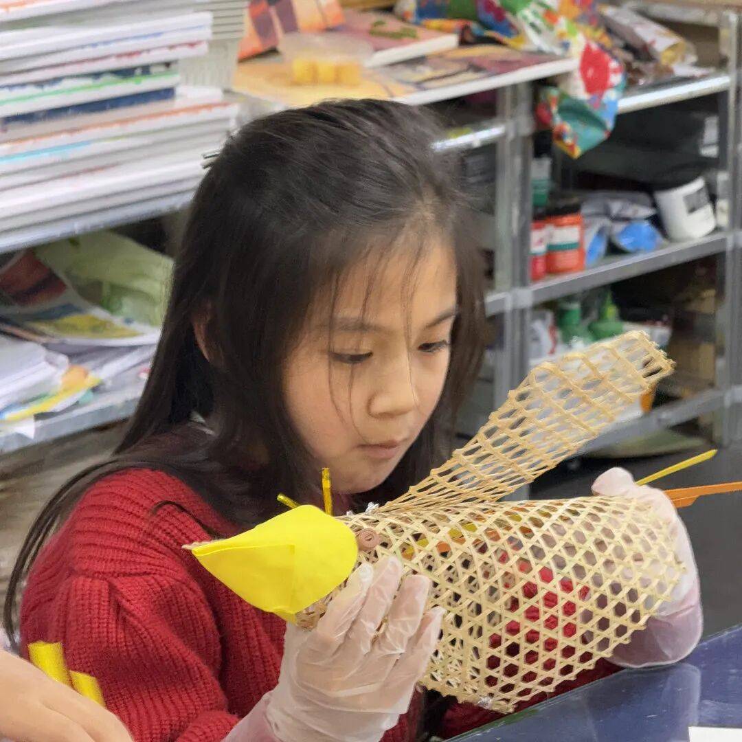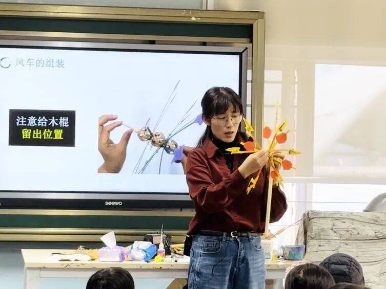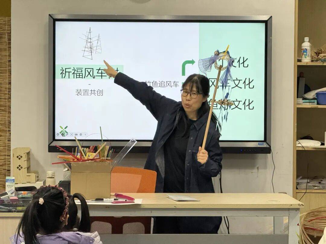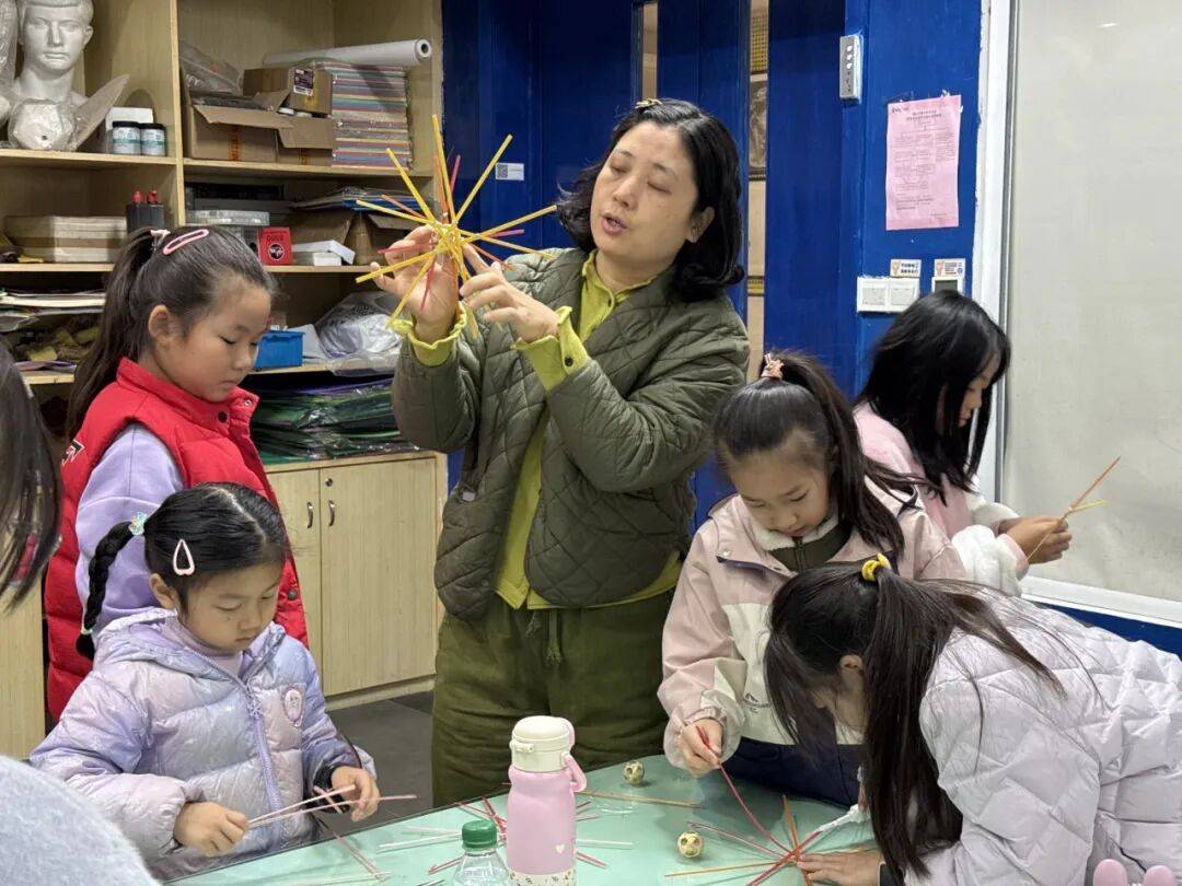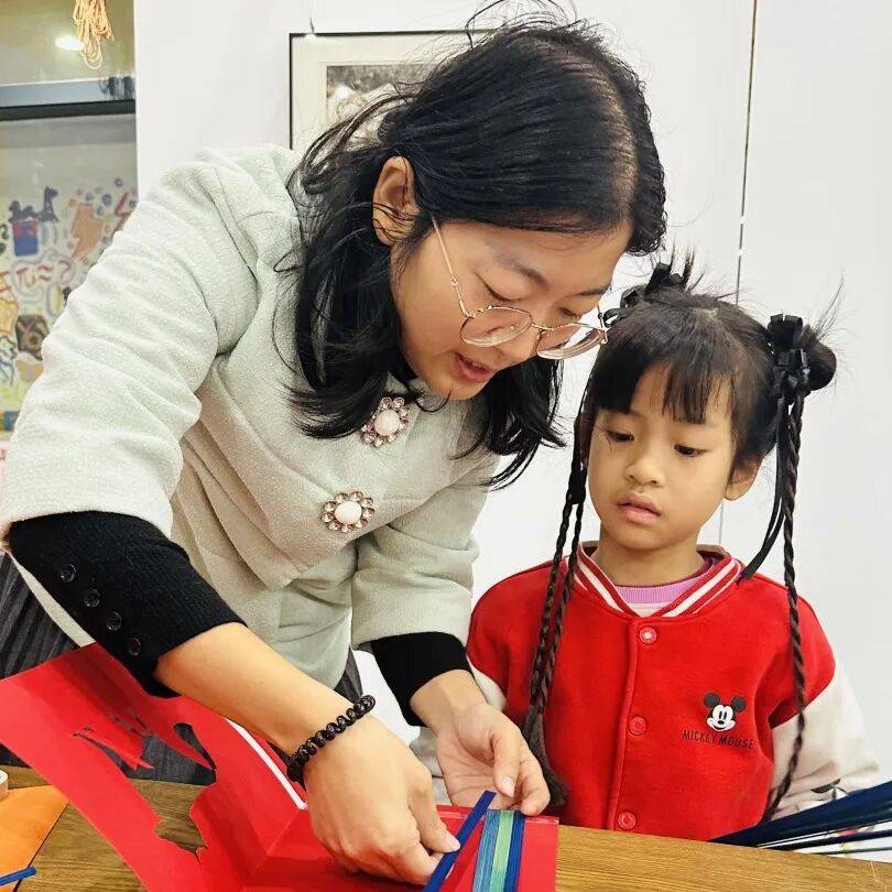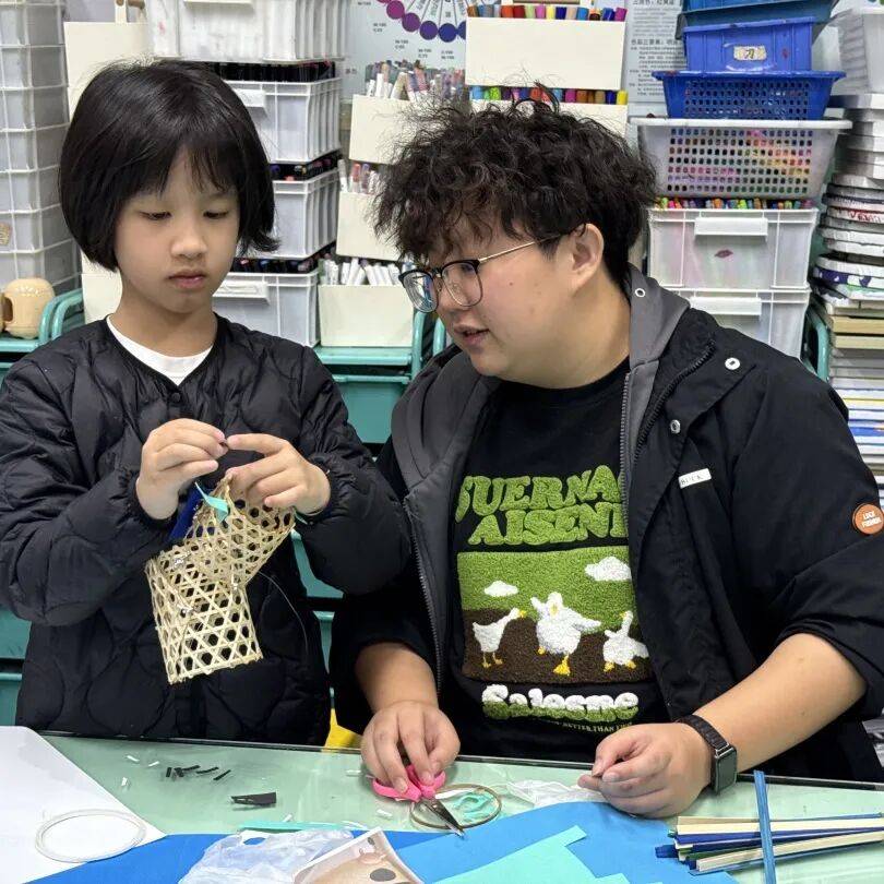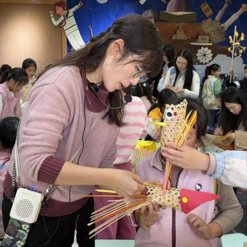 老师教授孩子竹编风车技巧