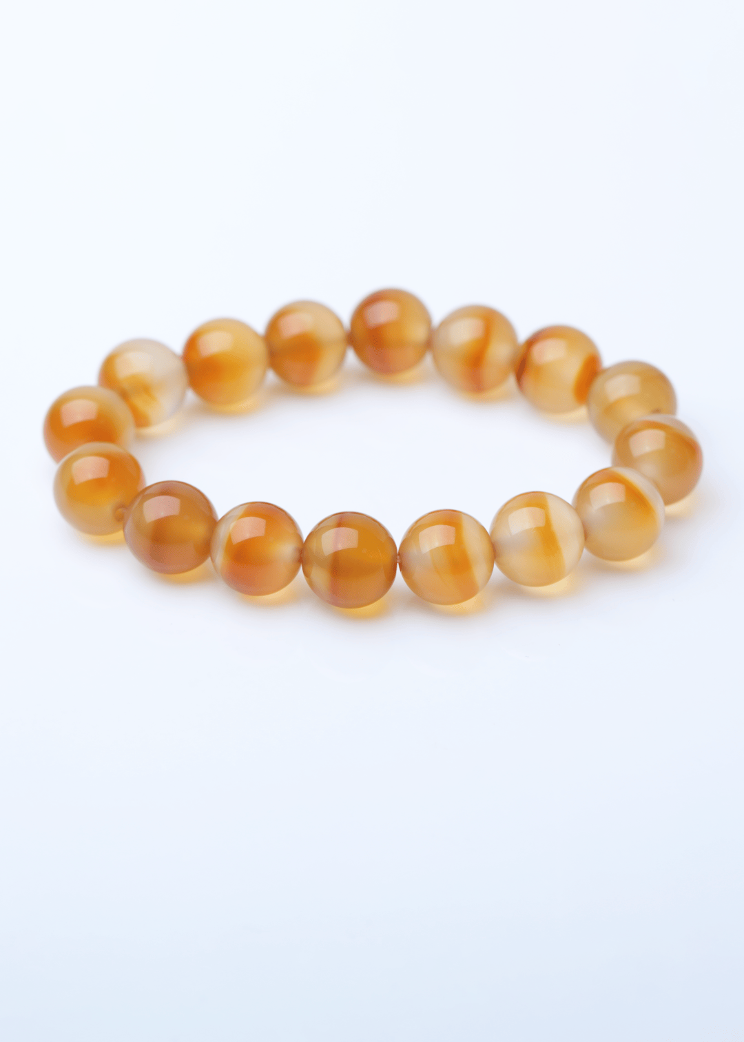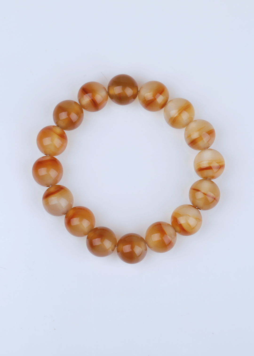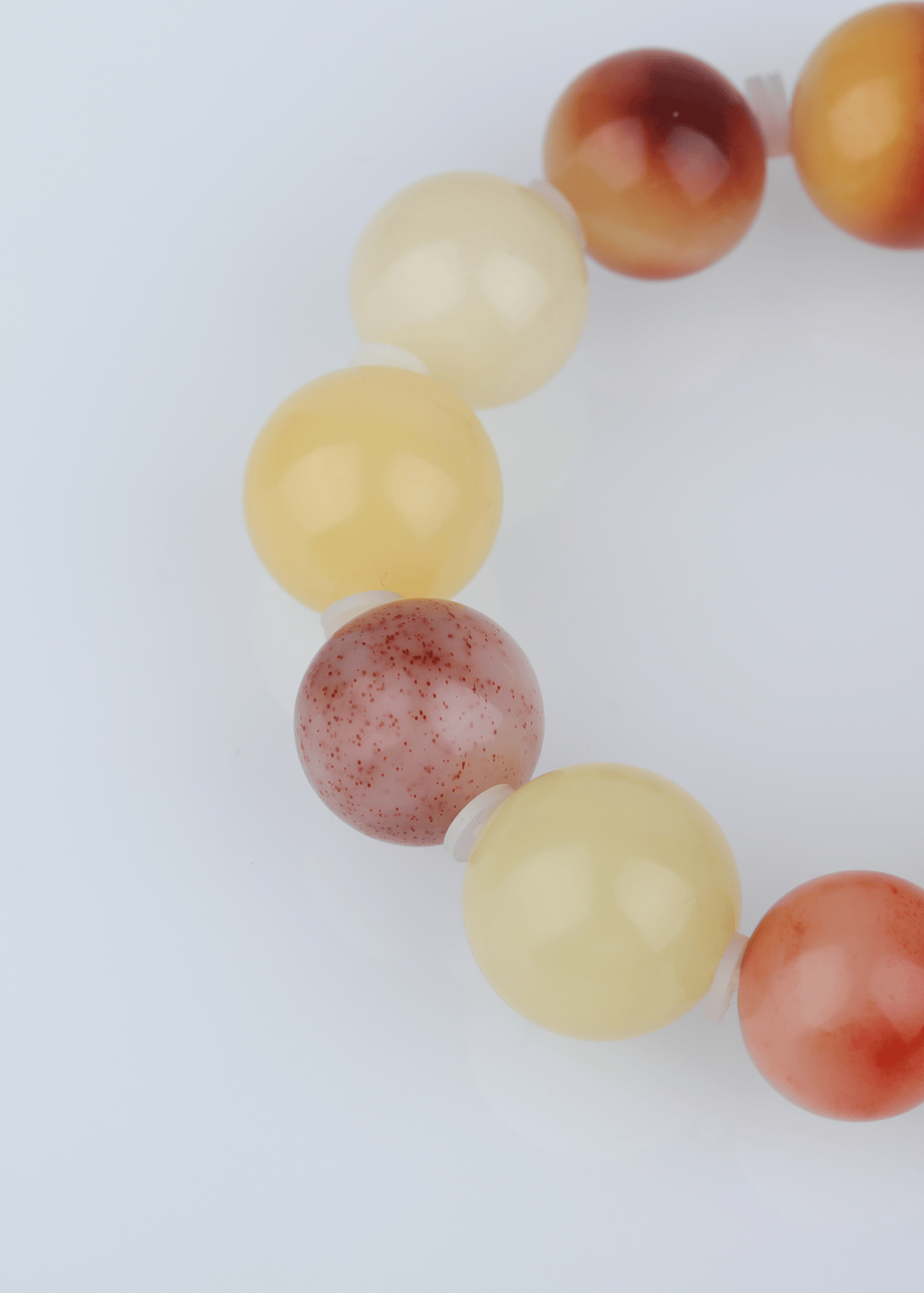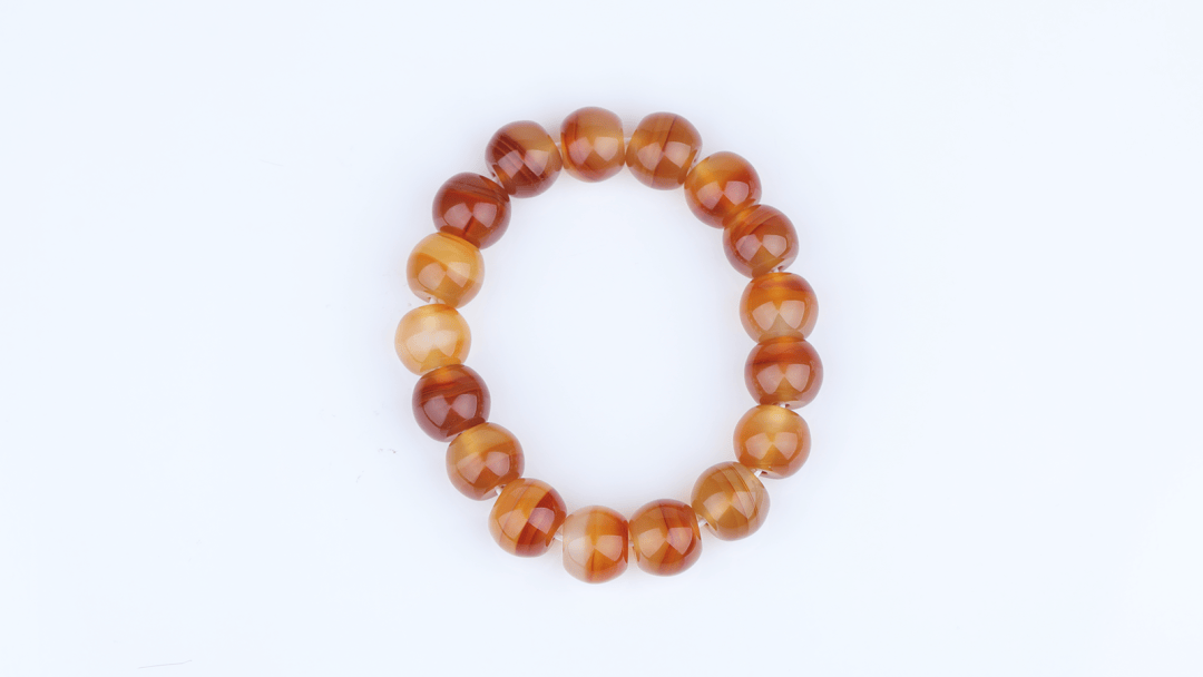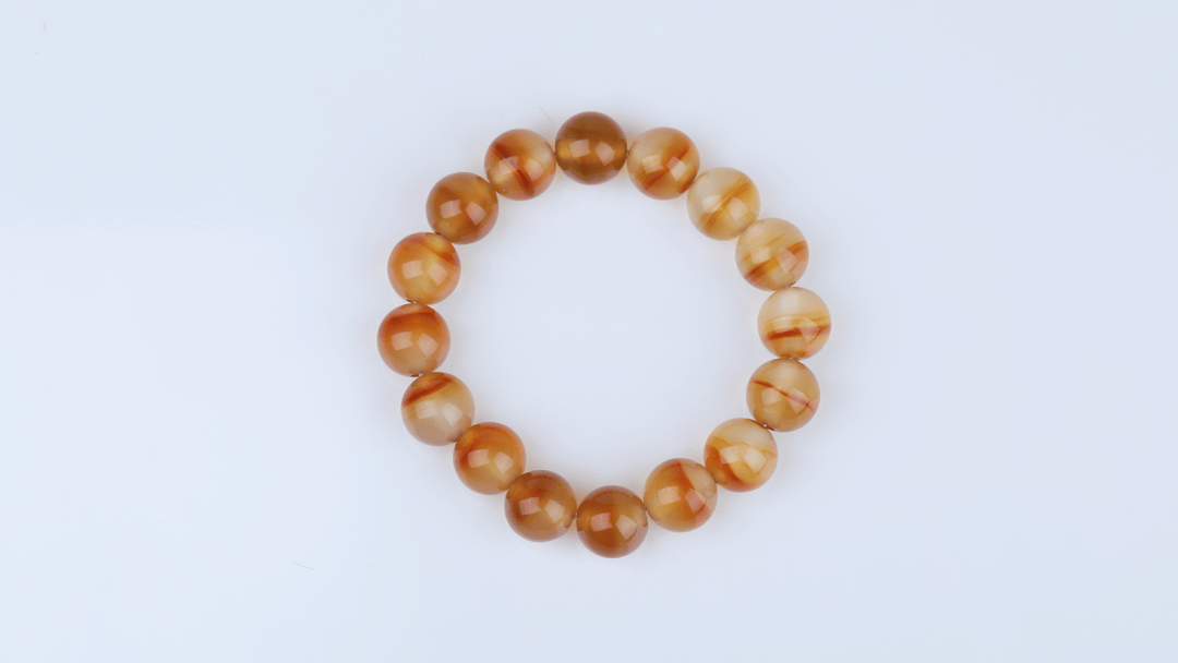 这件手串材质同样是北红玛瑙,以浅橙、米白为基底,