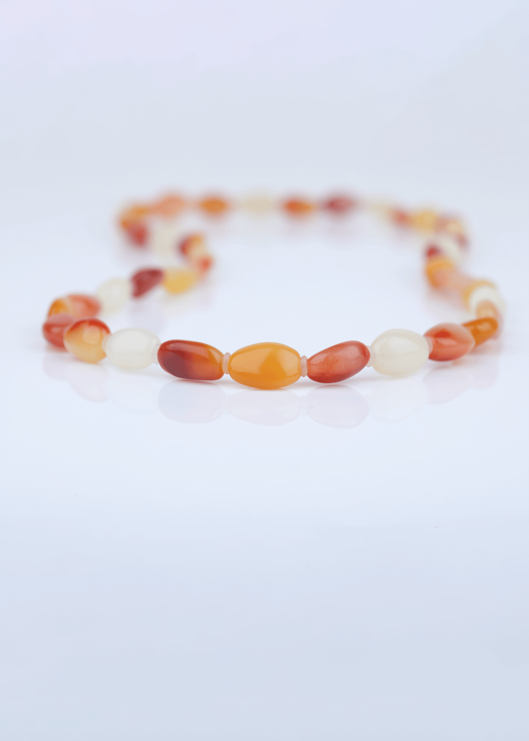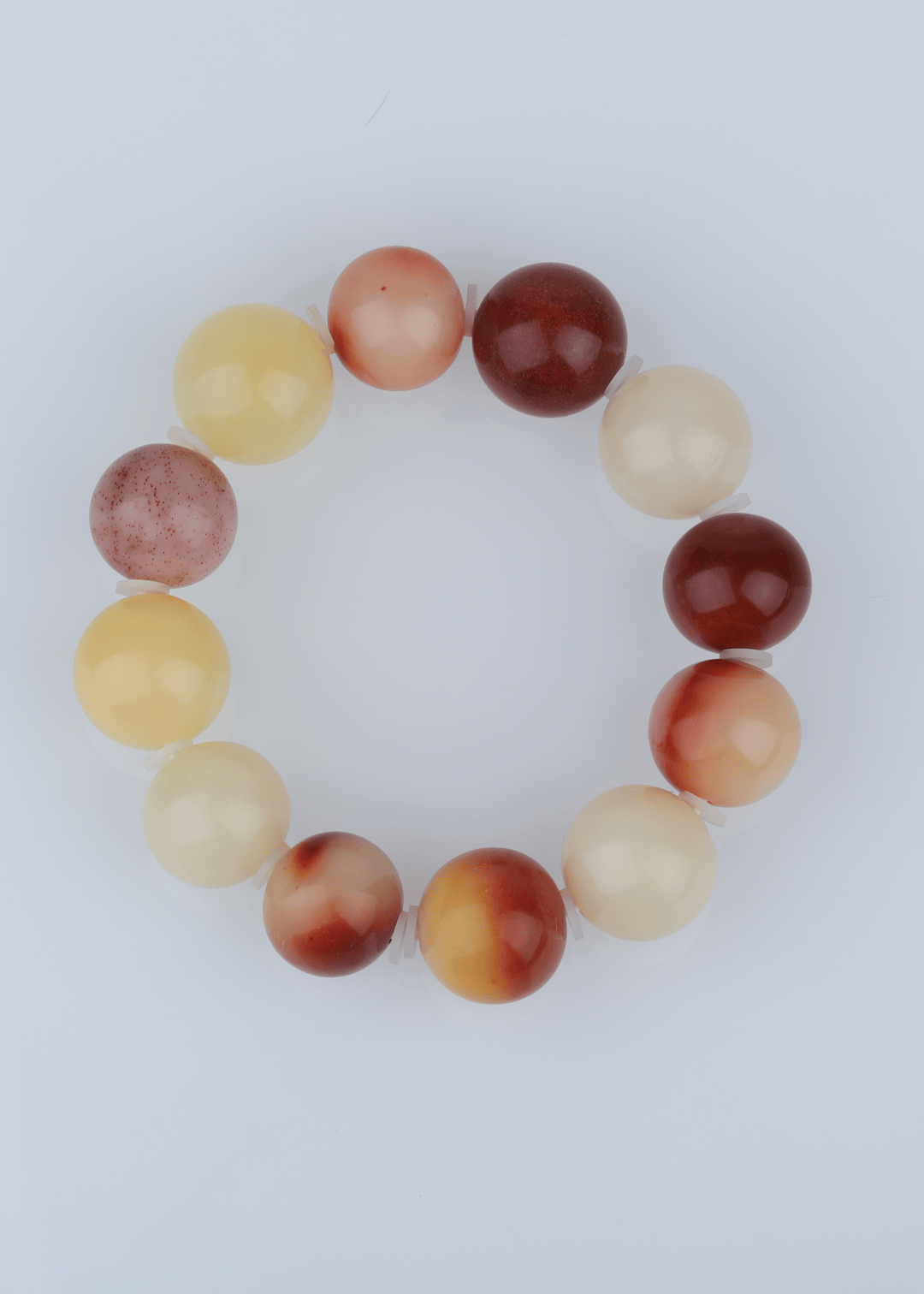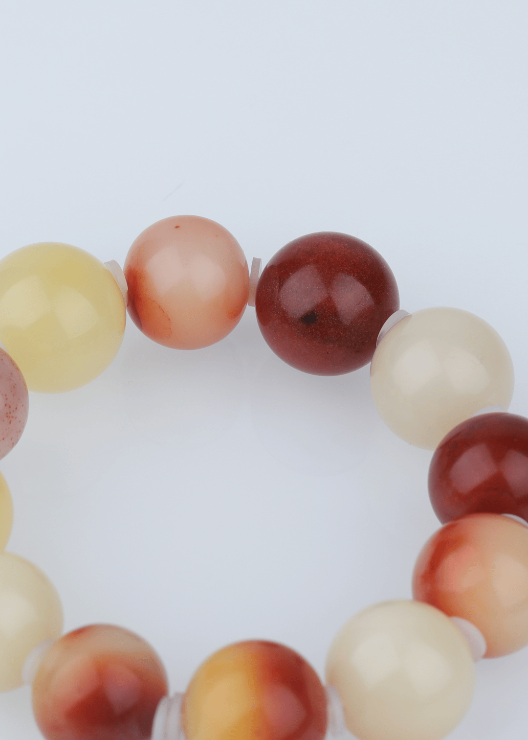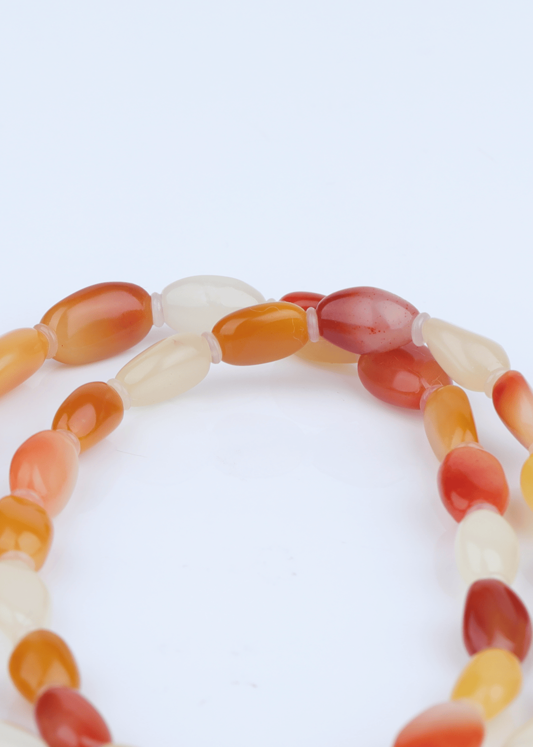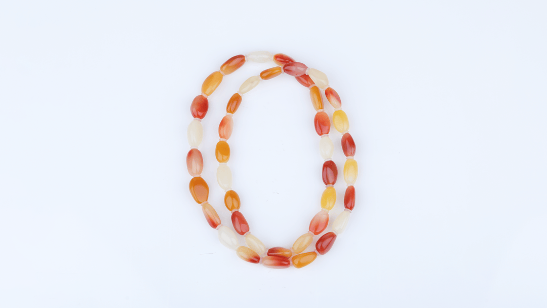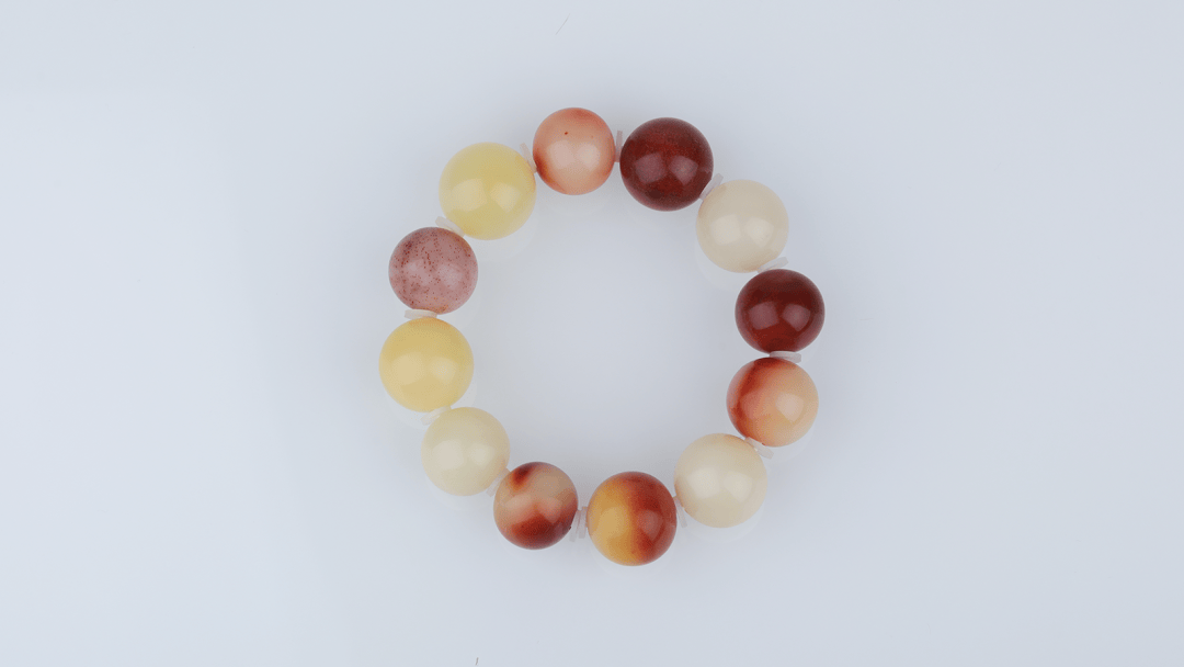 这件手链选用寿山芙蓉石,以红、橙、乳白三色渐变串制,