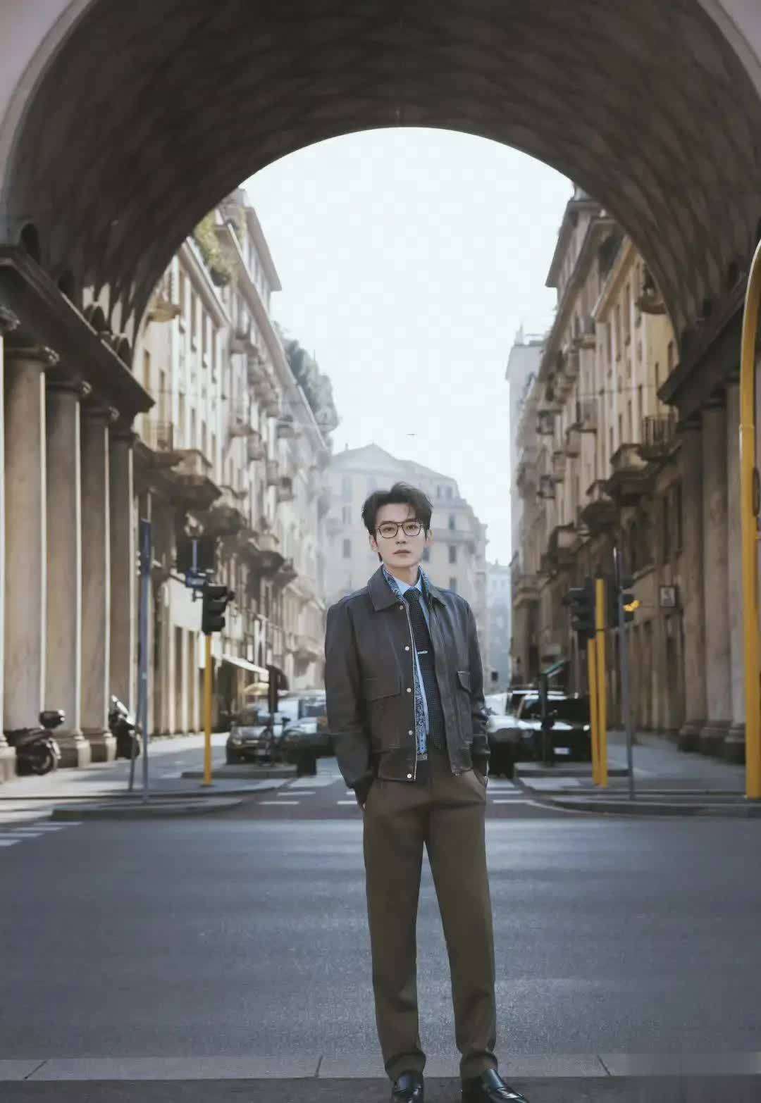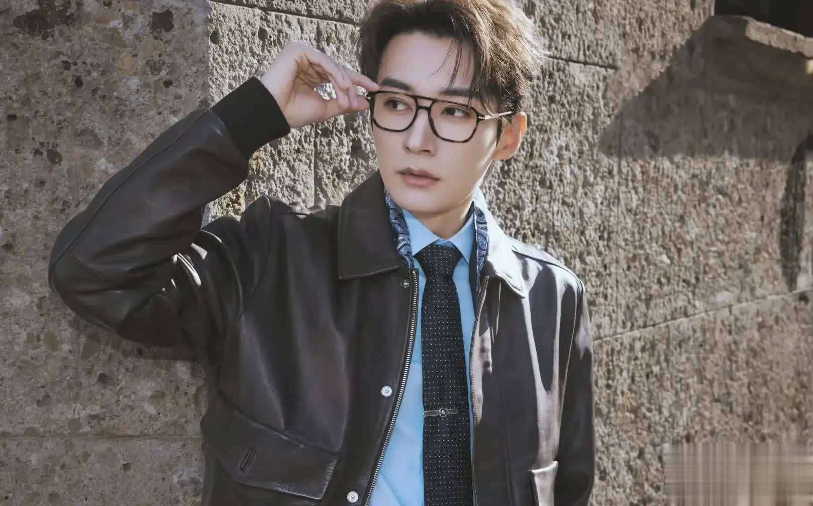 这次造型的核心亮点,毫无疑问是那件深棕色真皮夹克。内搭蓝色衬衫,配上真丝花卉领带👔,再加一副金丝眼镜👓,整个组合简直就是高智感的完美写照。183cm的身高在利落剪裁的衬托下尽显优势,宽肩窄腰的倒三角身材被网友戏称为行走的人体光影装置。尤其是他的面庞,立体骨相配上凌厉的眉眼线条,既有东方儒雅,又带着冷峻精英的气息,这种带着年上感的魅力,真是让人难以抗拒。