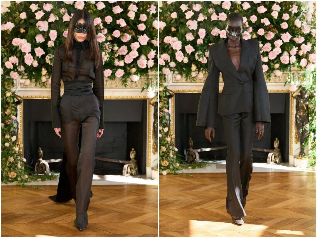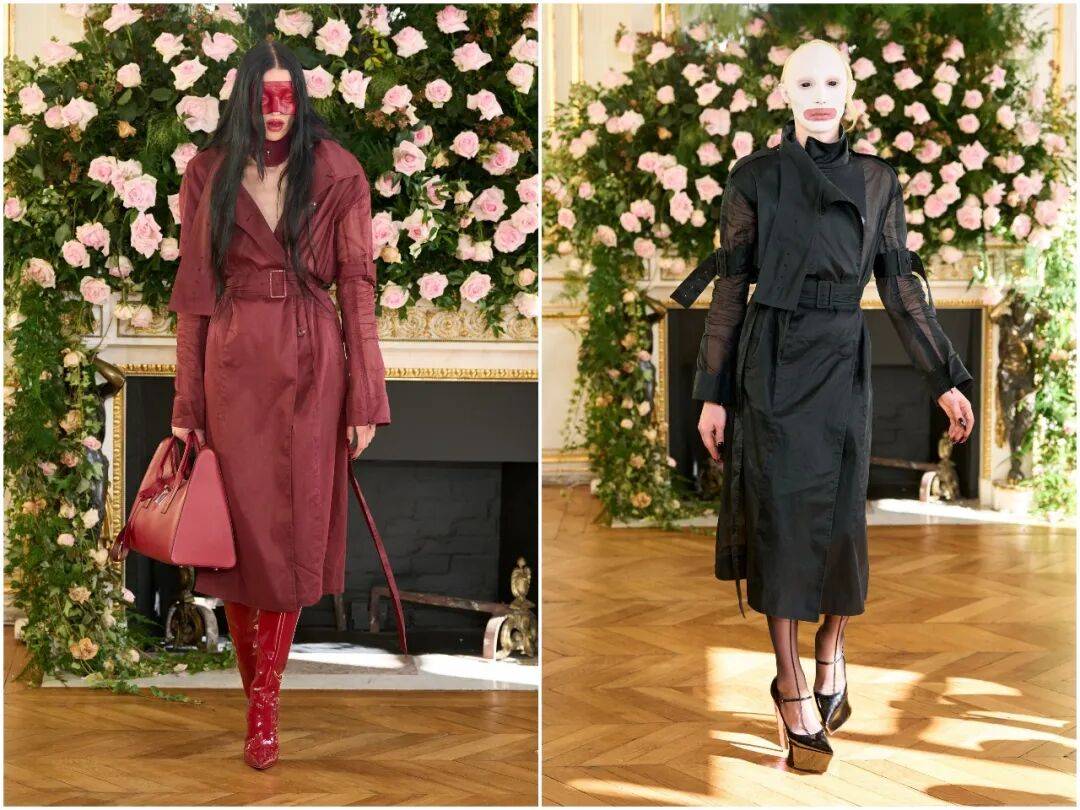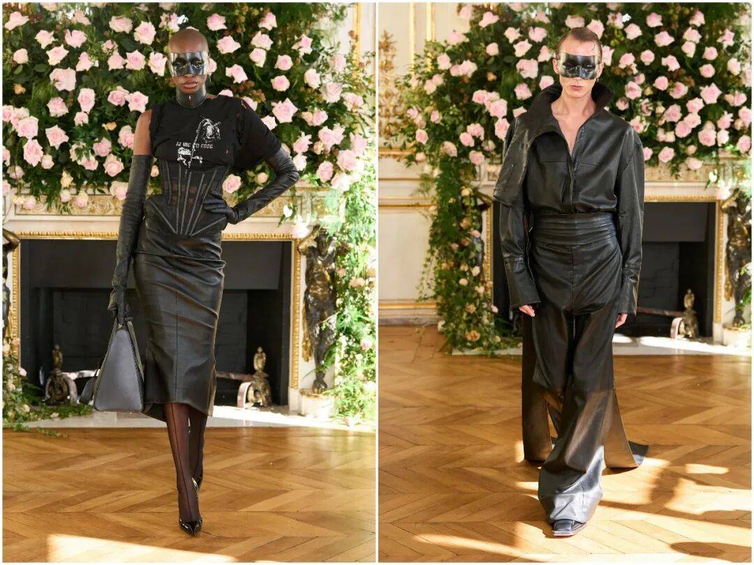 廓形设计延续品牌标志性的尖肩、收腰、不对称结构,同时加入更多流动感。西装、裙装、斗篷、连体衣在身体上形成利落的几何切割,既强化力量感,又不束缚肢体。这是属于后人类时代的身体语言:独立、清醒、不可侵犯。