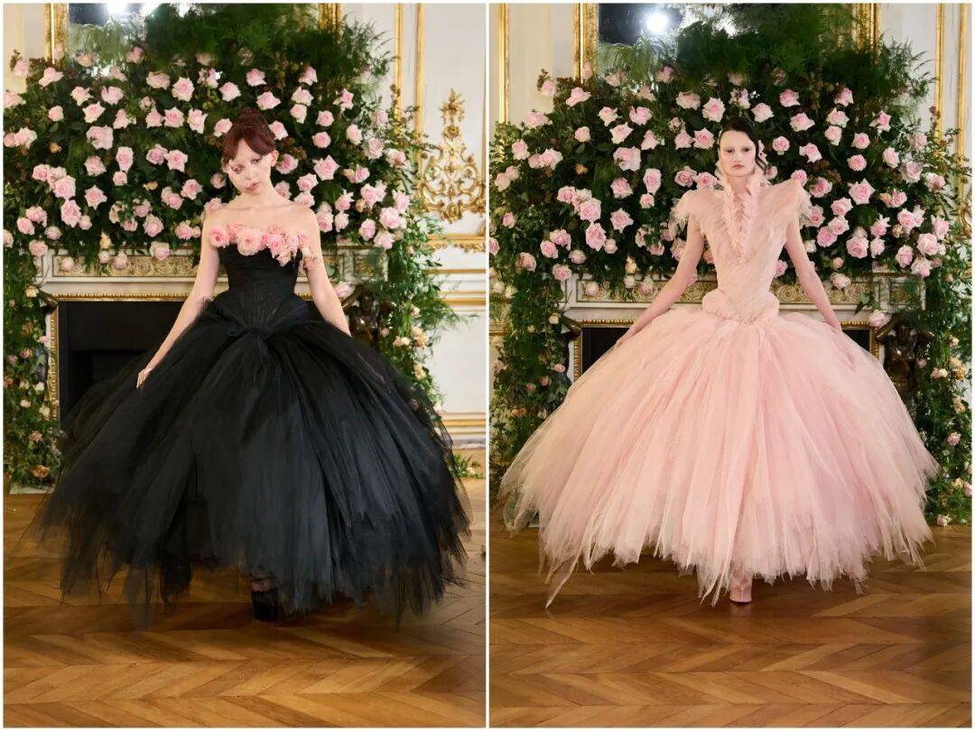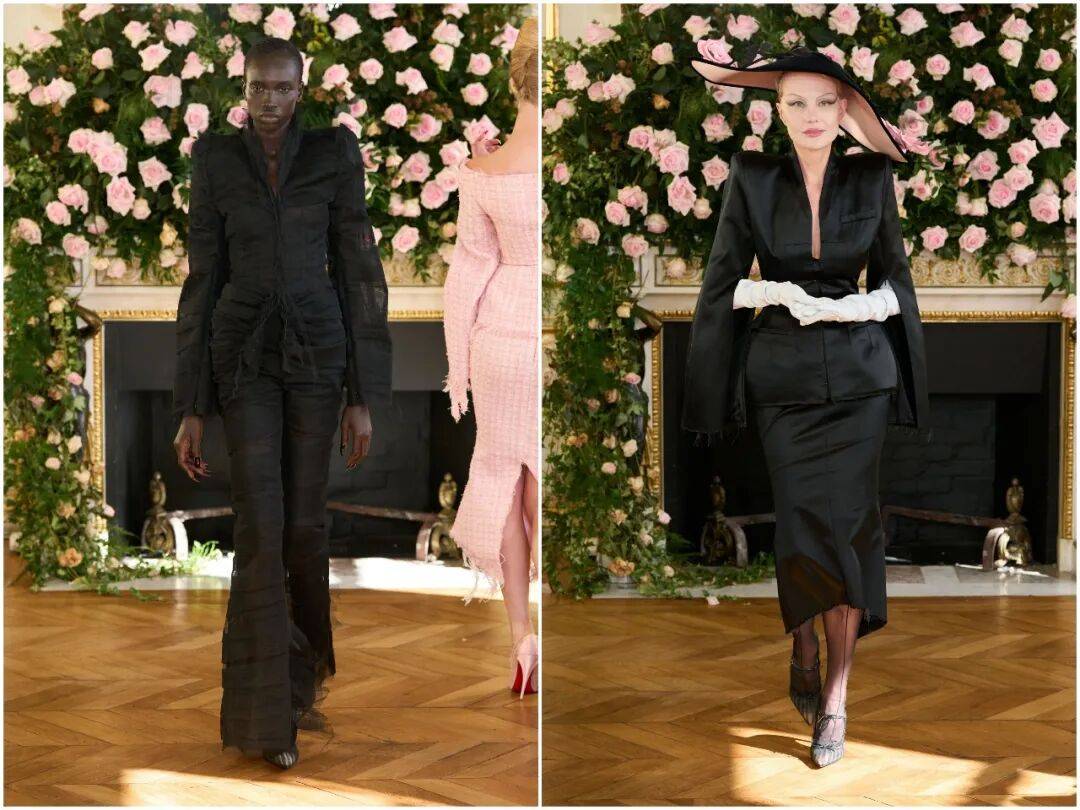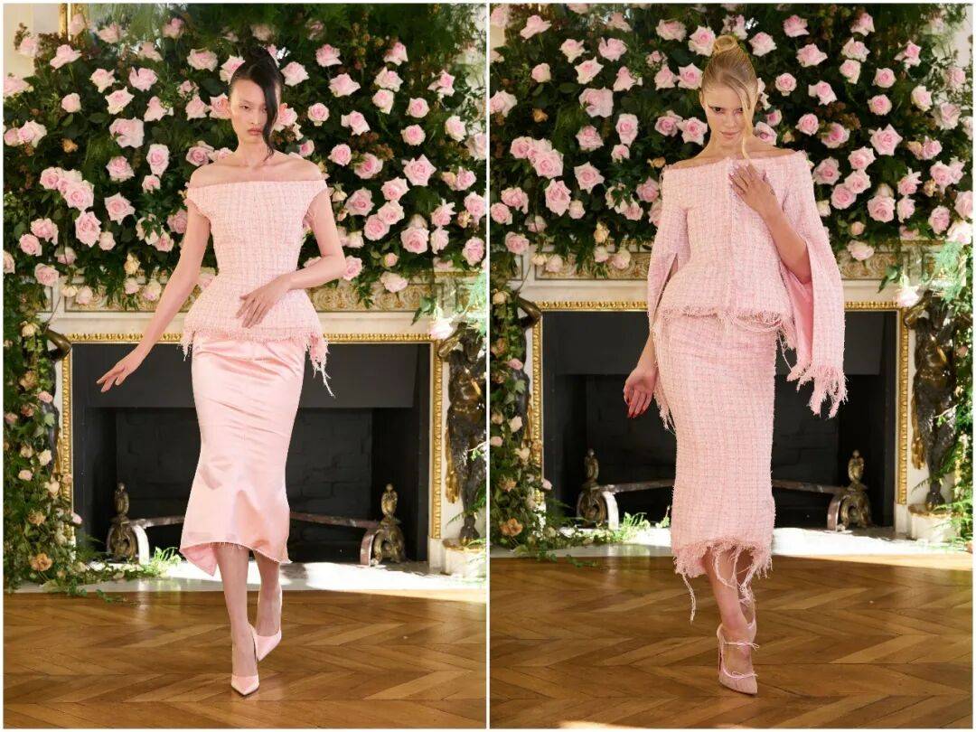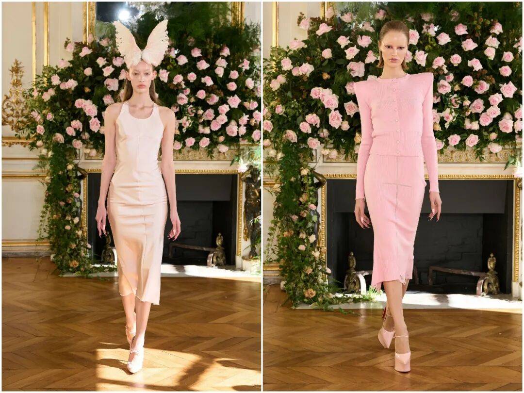 秀场以一袭粉色公爵缎造型拉开序幕。精准利落的剪裁如同贴身盔甲,线条硬朗、结构分明,仿佛为身体筑起防御;但流畅的弧度与垂坠感,又在刻意保护着内里的柔软。刚与柔的对立,从第一套Look就钉住全场目光。