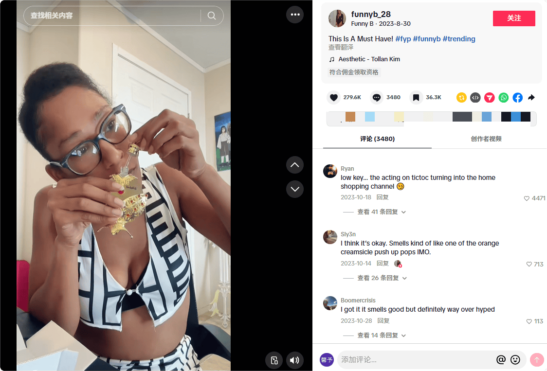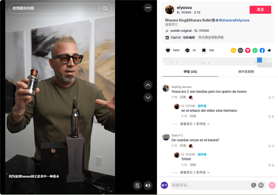 他们近期合作的TikTok达人@elyosva就是很好的例子,他是一名具有近24万粉丝的香水爱好者,长期分享原创香评与测评内容,对香水的描述专业接地气,粉丝大多是精准的『香氛』消费群体,认可度和信任度都很高。