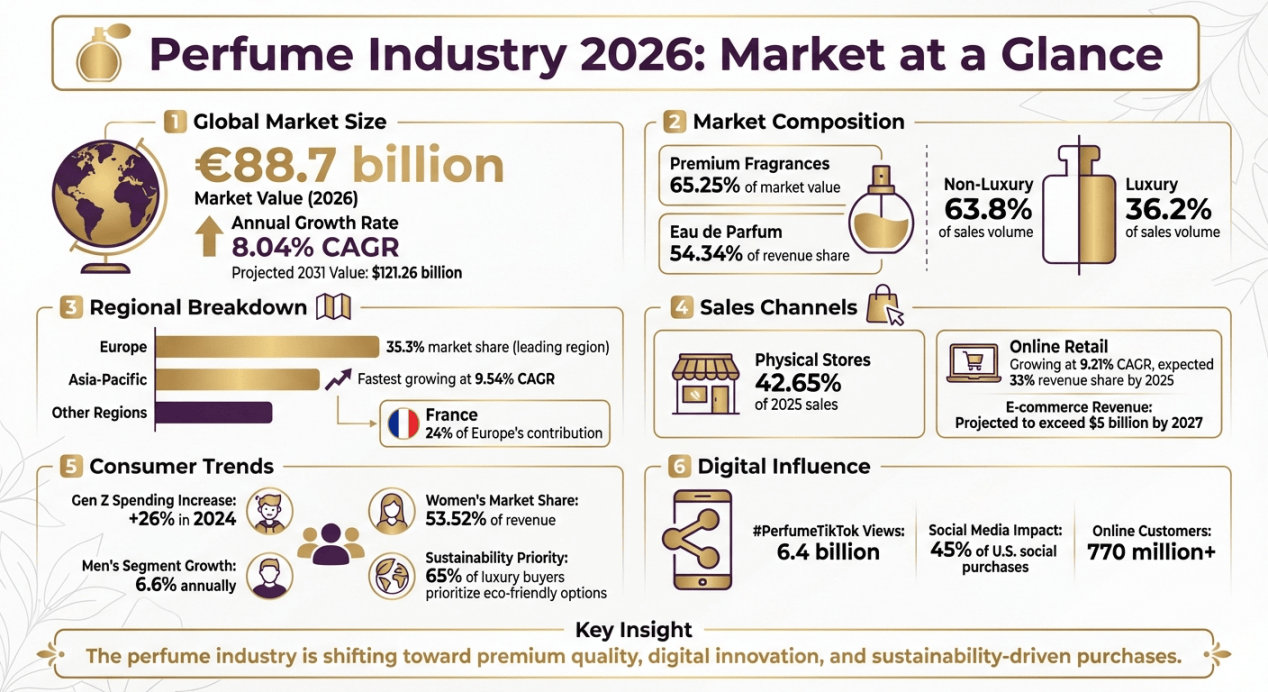 有数据显示,全球香水市场正高速增长,2026年销售额预计达887亿欧元💶,年增长率8.04%,增速将超过『化妆品』、护发产品等传统美妆品类。在这股增长的浪潮背后,是消费主力的更迭和消费观念的剧变。