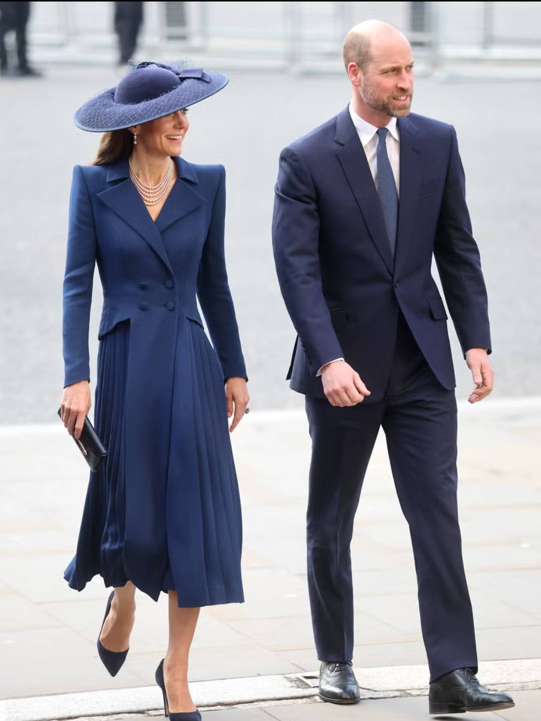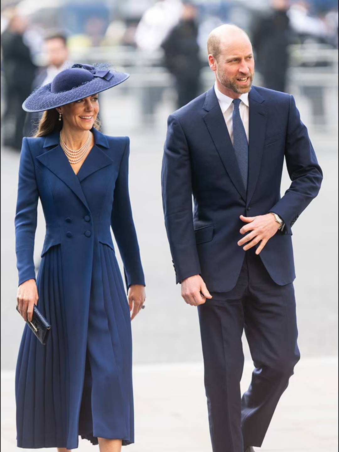 当天,威尔士亲王威廉王子,和王妃凯特一同现身。他们穿着十分搭调,都是蓝色系服装。凯特身着凯瑟琳·沃克品牌的外套🧥,还配了同款的帽子,整个人优雅又大方。