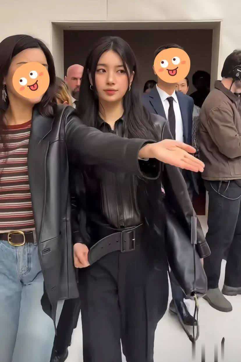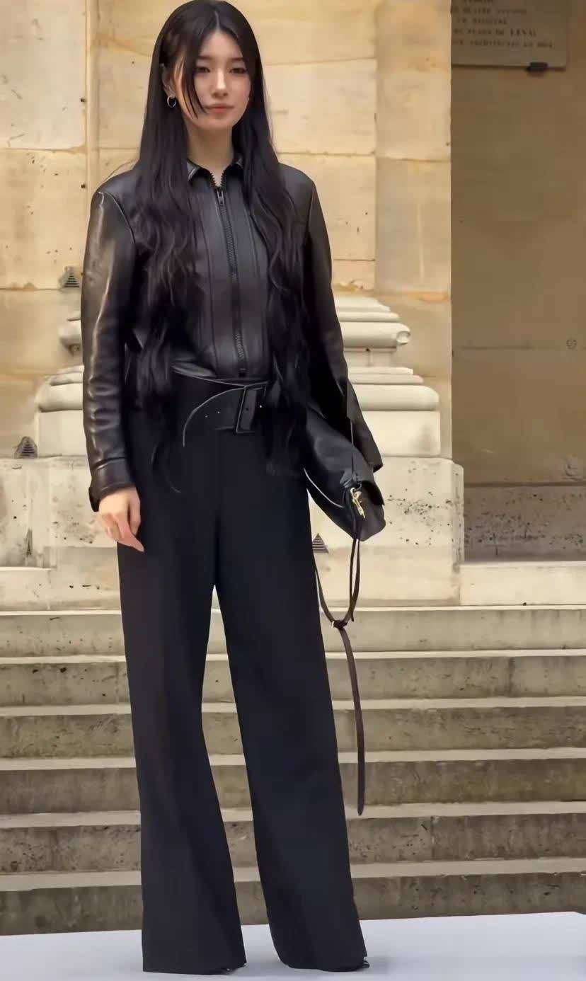 在舞台前,她缓缓登上品牌方精心准备的区域,配合摄影师的镜头摆出各种姿势。她穿着黑色皮衣外套🧥,搭配黑色西裤,腰间系着一条粗黑腰带,手中拎着大号『马鞍包』,脚踩黑色高跟鞋👠,从头到脚的黑色单品让她散发出低调却不失力量感的气场。