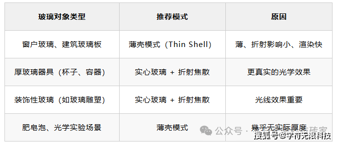 - 薄壳模式最大的优点是渲染速度快,适合大多数场景中的窗玻璃等无折射效果需求。