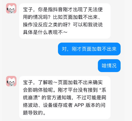 对此,『抖音』客服回应称:“刚才平台没有接到"系统崩溃"的官方通知,不过可能是网络波动、设备缓存或者APP版本的问题导致。建议换个网络/清理下缓存/看看APP是不是最新版本。”