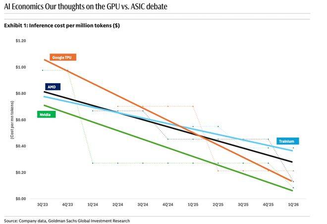 一点通的TPU配合TensorFlow和Gemini,让其在AI算力成本上拥有了极高的护城河。高盛的研究指出,随着迭代,专用ASIC『芯片』的推理成本降幅远超通用GPU。