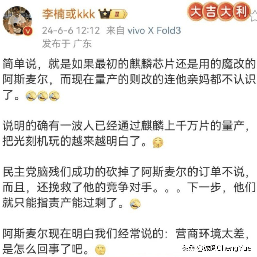 曾经华为Mate60 Pro搭载的麒麟9000S,还有魔改荷兰ASML光刻机的影子,但现在的麒麟『芯片』,ASML的影子都没有了。没有荷兰的光刻机,也能造出5纳米及以下的『芯片』。如此,漂亮国在光刻机制程上,算是卡不了脖子了,只能搞什么“产能过剩”荒诞招数了。