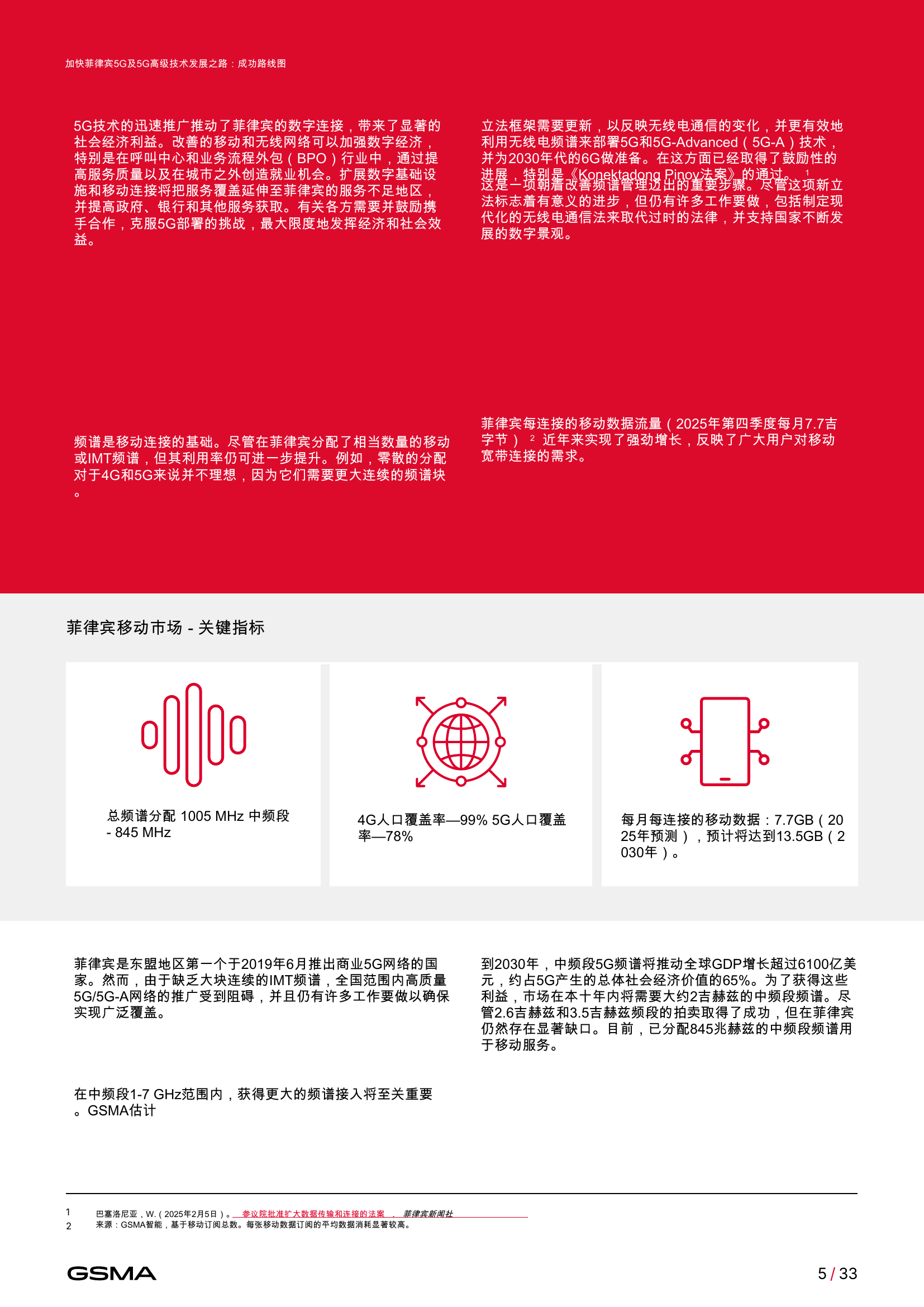 菲律宾是东盟地区第一个于2019年6月推出商业5G网络的国家。然而,由于缺乏大块连续的IMT频谱,全国范围内高质量5G/5G-A网络的推广受到阻碍,并且仍有许多工作要做以确保实现广泛覆盖。