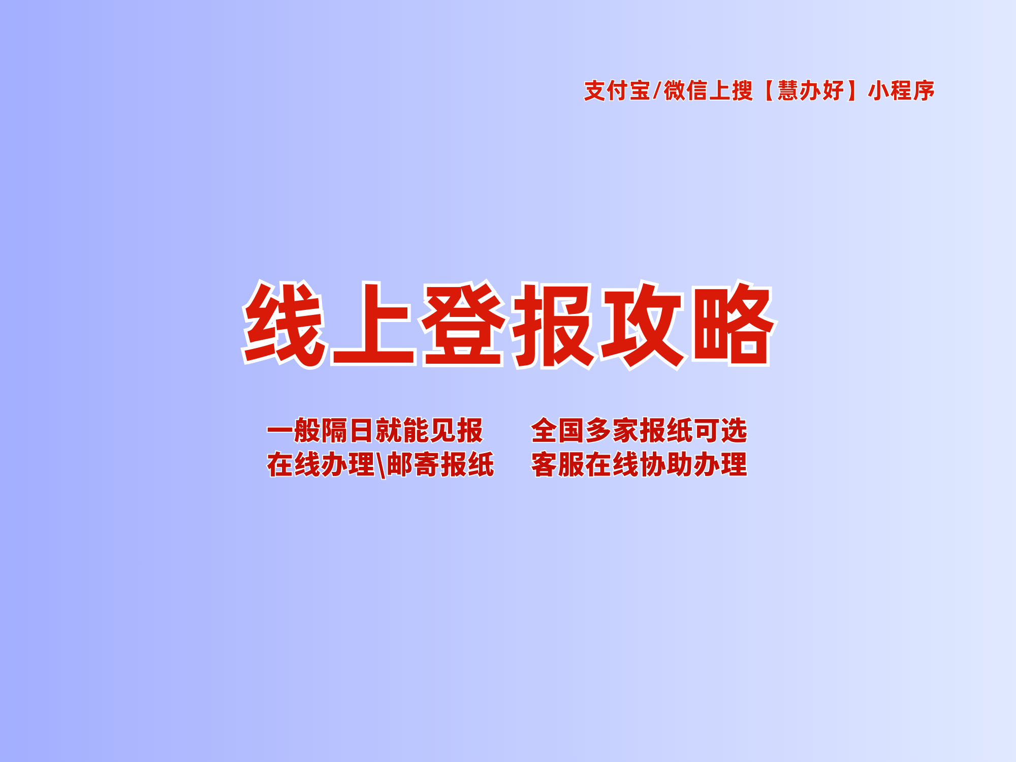 线上方式三:就是通过正规登报平台办理,这种方式整合了多家正规报社的资源,选择多、流程简单、刊登速度快,而且操作特别简单,小白也能轻松上手,尤其是不清楚登报要求、需要快速登报的朋友,选这种方式准没错。这里说个便捷的办理渠道,就是在『支付宝』或者微信上,搜索“慧办好”小程序,全程手机操作,10分钟就能完成申请,而且刊登速度快,次日见报,还能帮自己规避所有踩坑点。