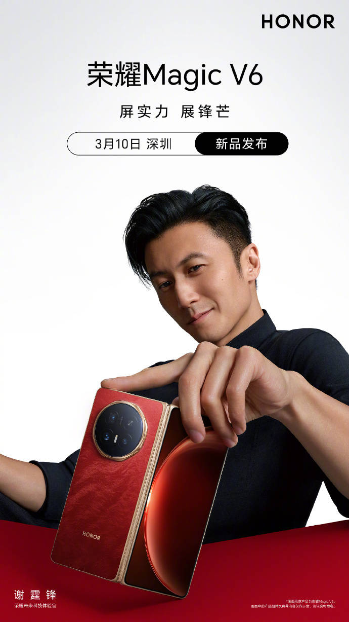 荣耀官方正式官宣,年度重磅折叠屏旗舰荣耀Magic V6新品发布会将于3月10日在深圳发布,本次发布会以“敢「屏」实力,大展「锋」芒”为核心主题,同时宣布『谢霆锋』出任荣耀未来科技体验官,与新品一同亮相,为消费者带来全方位升级的满血旗舰体验。