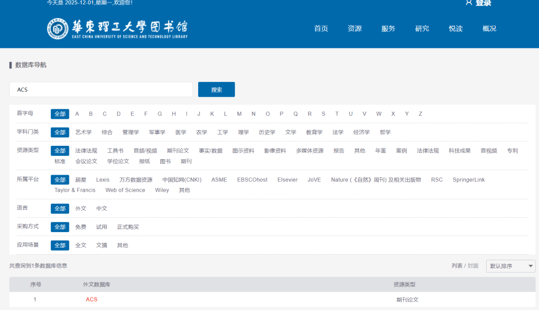 ❶ 图书馆主页-资源-电子资源-数据库导航- ACS查看
