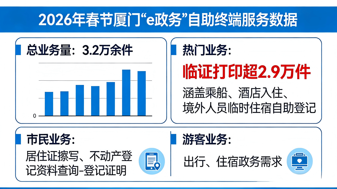 春节期间,厦门“e政务”自助终端凭借稳定的运行状态、便捷的办事体验,成为市民和游客办事的重要选择。据统计,2026年春节期间,全市“e政务”自助终端累计办理业务3.2万余件,高效满足了各类政务办事需求。