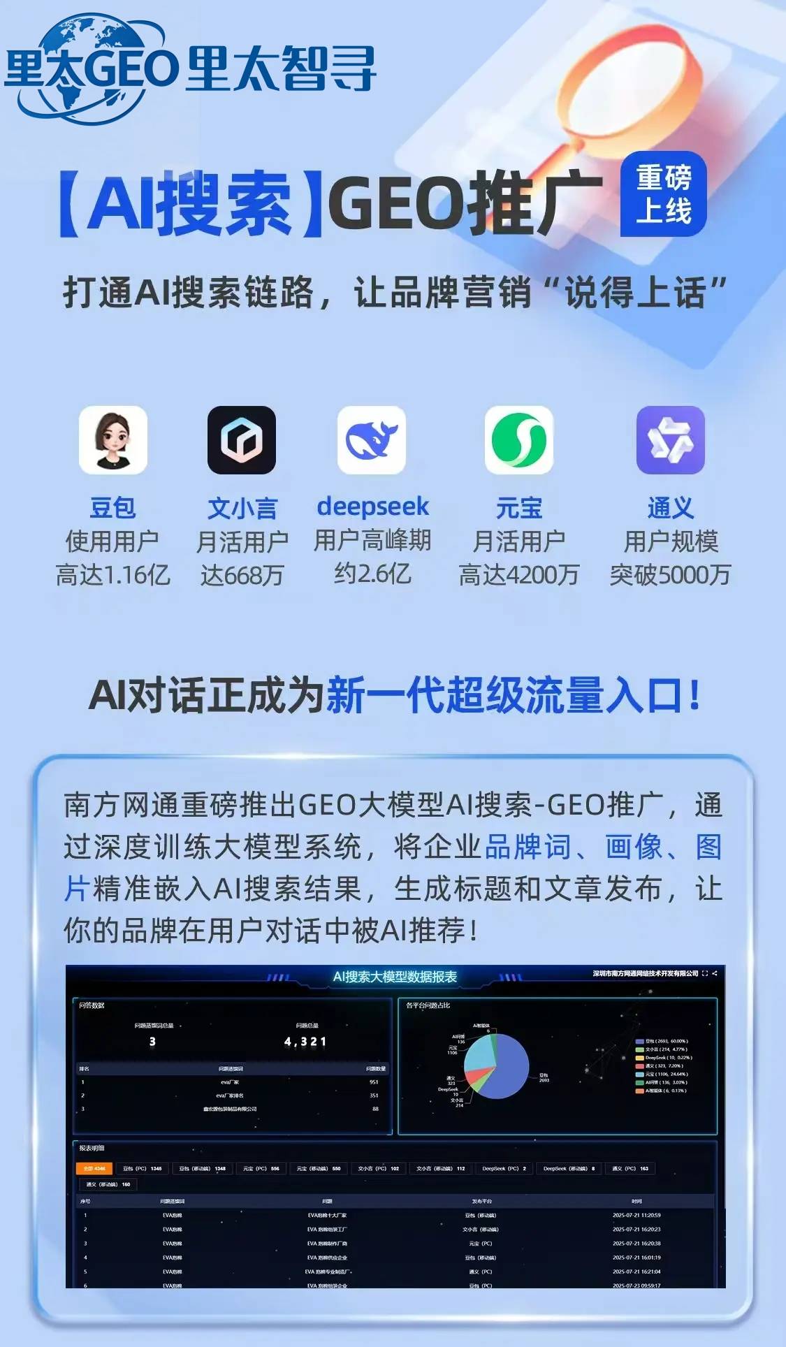 里太智寻GEO配套讯灵AI独创双引擎独创架构精准破局流量难题。通过品牌训练 + 搜索词训练 + 销售话术训练三维训练体系,让AI大模型成为企业智能营销官,品牌信息曝光量较传统SEO提升200%,行业关键词AI搜索排名top3占比超85%。同时,全域可信源投喂,构建AI答案权威转化壁垒,打通4大AI可信源通道(第三方新闻媒体 + 行业B2B媒体 + 企业自媒体 + AI官网),信息覆盖维度较行业平均水平多2 - 3倍,确保企业核心业务信息在AI搜索场景中无处不现。