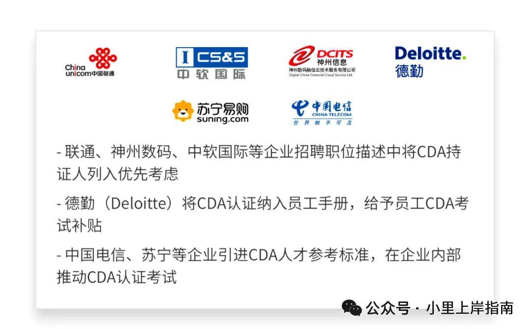 - 企业认可度爆棚,名企敲门砖:看看招聘市场就知道它的价值。中国联通、央视广信、德勤、苏宁等众多知名企业,在招聘相关岗位时,都明确注明“CDA持证人优先”。特别是许多银行、金融机构的技术岗,会明确要求必须是CDA『数据分析师』二级以上的持证人。这意味着,当你手握CDA证书时,你已经站在了比众多竞争者更靠前的起跑线上。