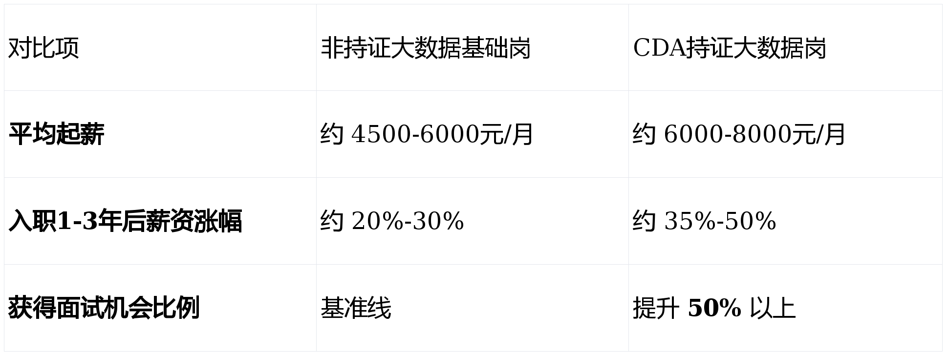从表格中可以清晰地看到,拥有CDA证书不仅意味着更高的起点,更意味着更快的职业成长速度和更广阔的发展空间。