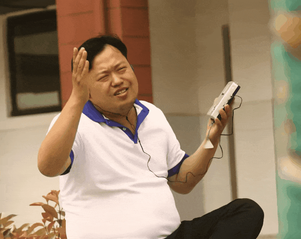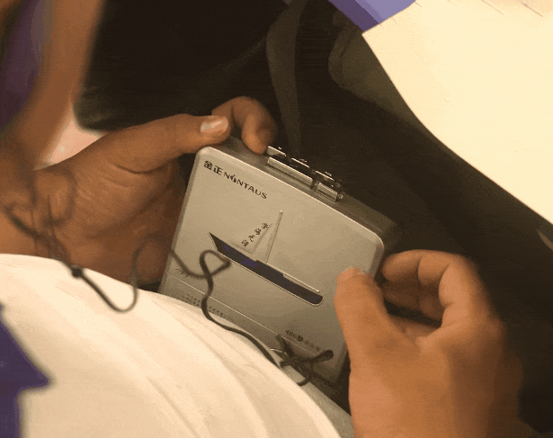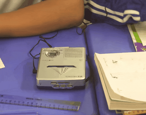 一根耳机线,一头连着复读机,一头塞进耳朵。