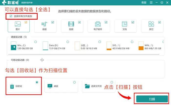 步骤1:首先将扫描范围直接指定为回收站,接着在界面中勾选需要恢复的文件类型(支持任意多项选择),随后启动已删除文件的扫描流程。