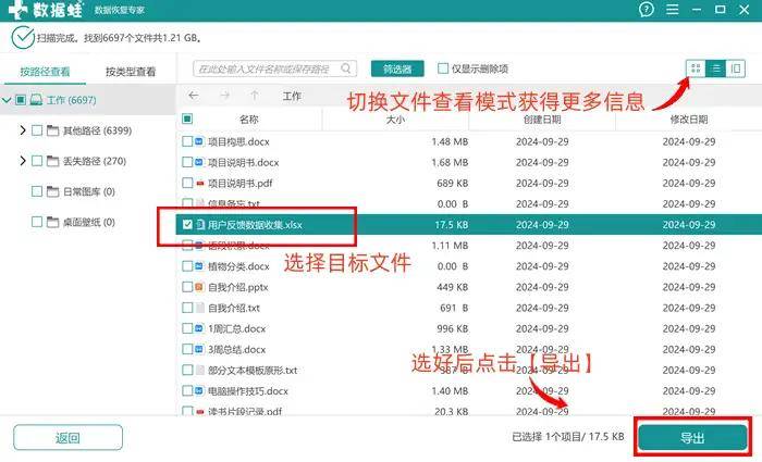 步骤2:等待扫描结果全部加载完成后,可借助侧边的筛选栏工具,对文件大类下的具体类型进行精准筛选,找到需要恢复的目标文件后,即可执行导出操作。