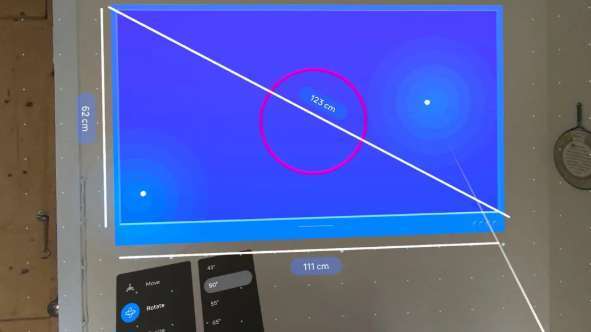我不需要用胶带和尺子去量墙上能放多大尺寸的电视,而是可以直接放置一个虚拟的屏幕布局,看看我能有多少摆放空间。结果显示,一台50英寸的屏幕可以恰到好处地放在那面墙上。