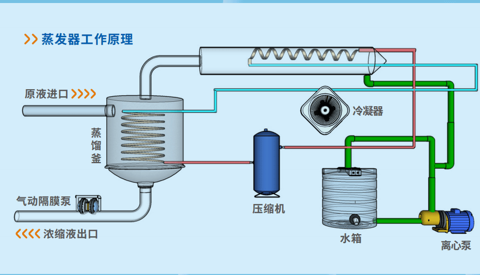 - 冷凝阶段:为了回收和利用蒸发的蒸汽中的热能,通常会设置冷凝器。蒸汽在冷凝器中冷却后凝结成水,这部分水可以作为回用水或其他用途。同时,冷凝过程中释放的热量也可以被回收利用,进一步提高系统的能效。