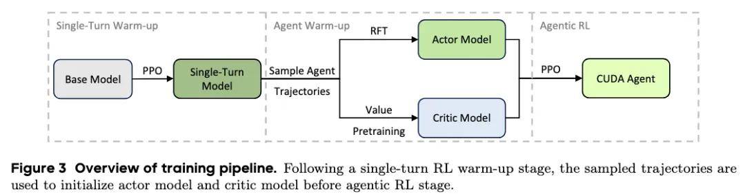 训练过程采用分阶段设计,以稳定 CUDA 编码这一长时序强化学习任务。首先进行单轮 PPO 预热训练,随后分别初始化 actor 和 critic,最后进入完整的多轮智能体强化学习阶段。