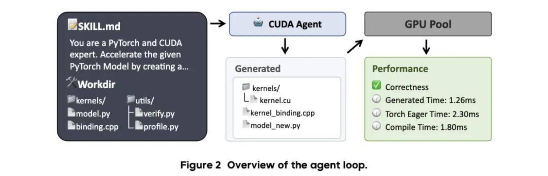 - 标准工作流程:对原生 PyTorch 实现进行性能分析,编写 CUDA 内核及其绑定代码,在 GPU 沙盒环境中完成编译,并不断迭代优化。