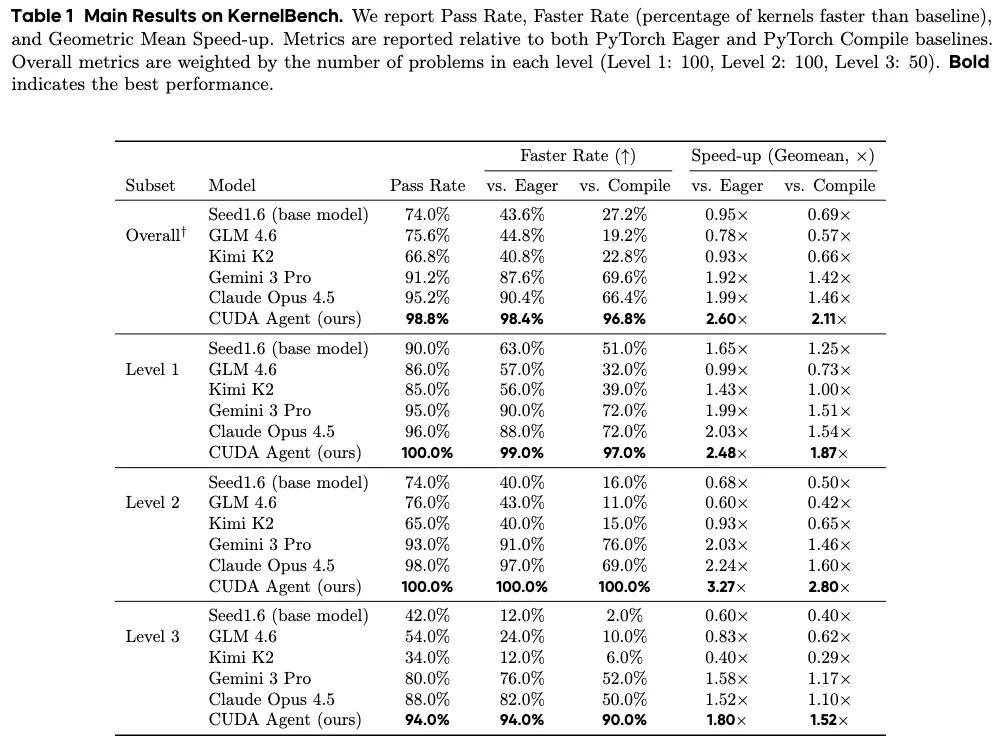 在简单/中等内核上,它的性能比 torch.compile 高出 2 倍;在复杂内核上,它的性能比 torch.compile 高出约 92%;即使在最难的设置下,它的性能也比 Claude Opus 4.5 和 Gemini 3 Pro 高出约 40%。
