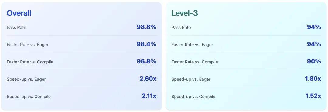 核心实验结果研究团队在 KernelBench 上报告了针对整体和 Level-3 拆分的完整指标,包括通过率、提速率(与 Eager 对比/与 Compile 对比)以及几何平均加速比(与 Eager 对比/与 Compile 对比)。